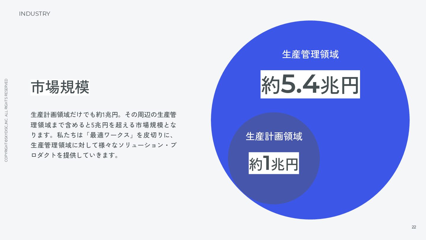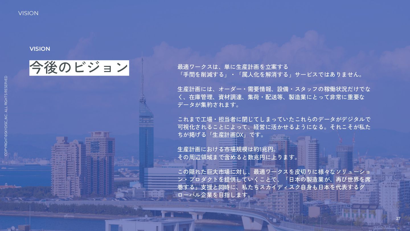 データが集約されます。 これまで工場・担当者に閉じてしまっていたこれらのデータがデジタルで 可視化されることによって、経営に活かせるようになる。それこそが私た ちが掲げる「生産計画DX」です。 生産計画における市場規模は約1兆円。 その周辺領域まで含めると数兆円に上ります。 この隠れた巨大市場に対し、最適ワークスを皮切りに様々なソリューショ ン・プロダクトを提供していくことで、「日本の製造業が、再び世界を席 巻する」支援と同時に、私たちスカイディスク自身も日本を代表するグ ローバル企業を目指します。 今後のビジョン VISION