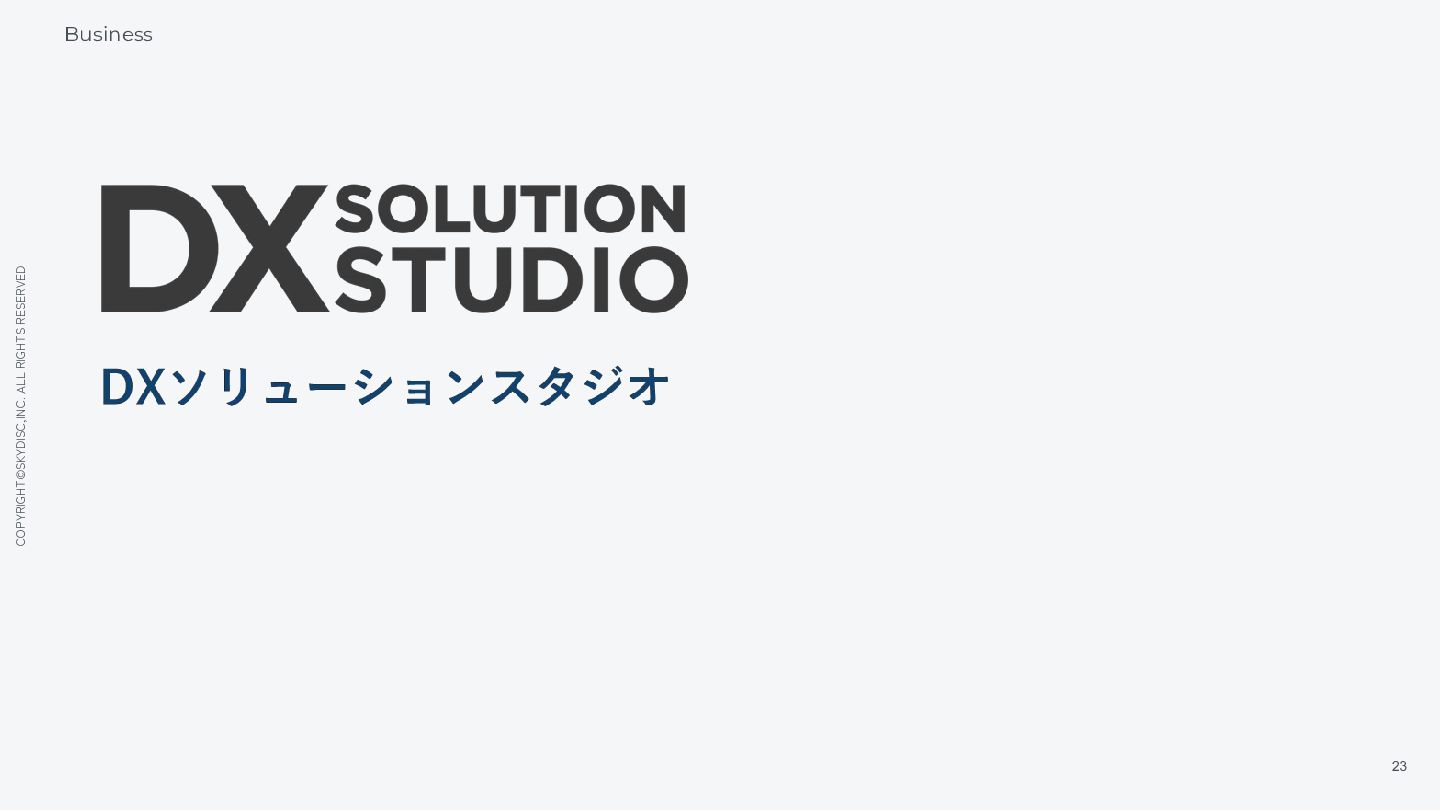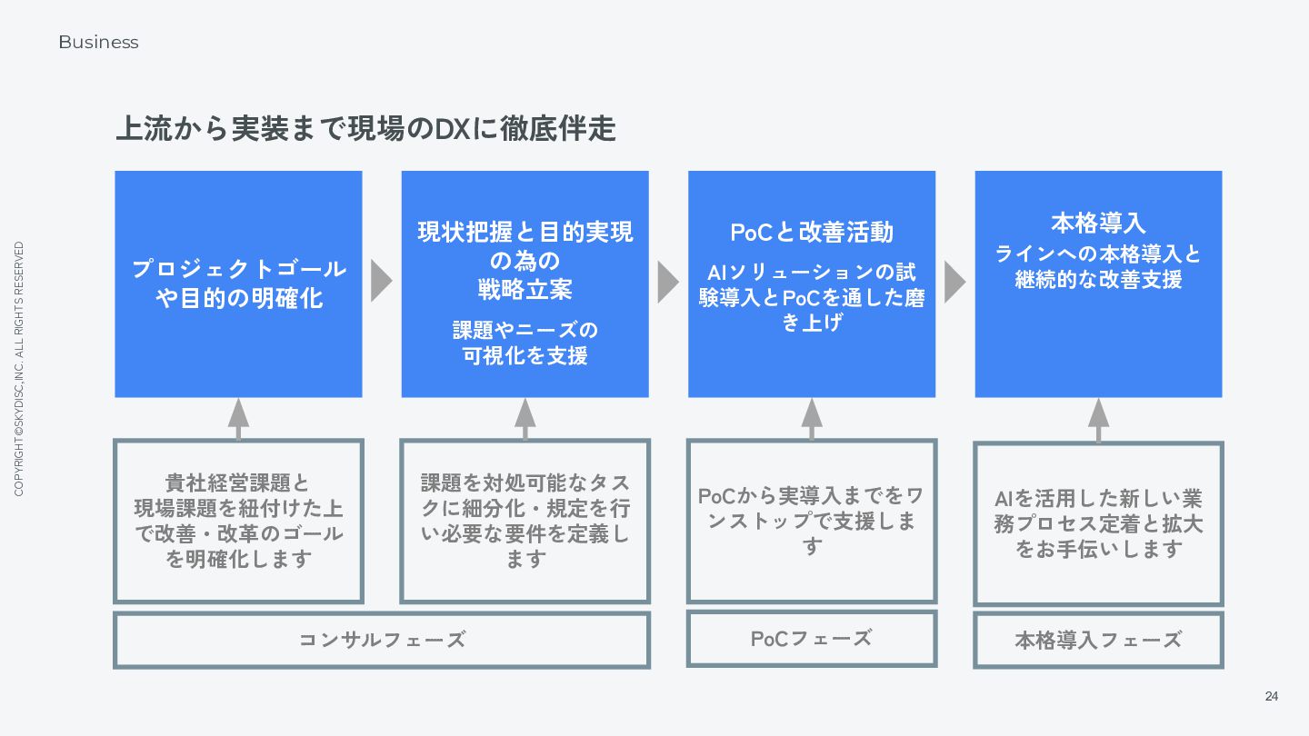 15. COPYRIGHT©SKYDISC,INC. ALL RIGHTS RESERVED 24 Business 上流から実装まで現場のDXに徹底伴走 プロジェクトゴール や目的の明確化 現状把握と目的実現