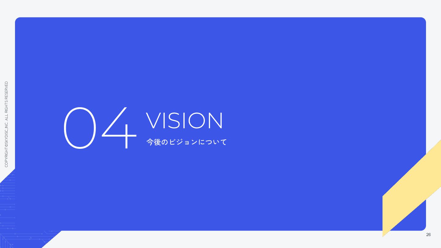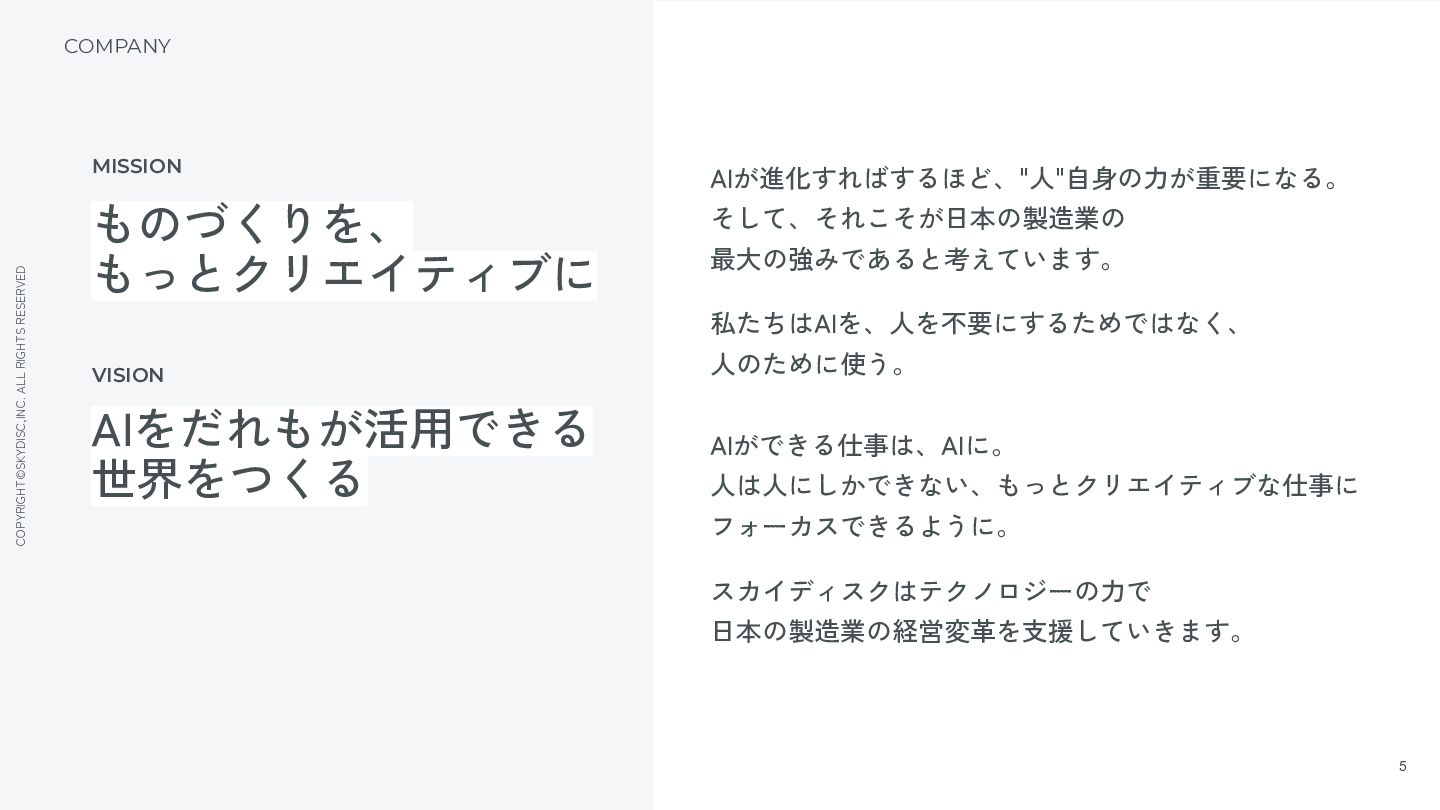 3. COPYRIGHT©SKYDISC,INC. ALL RIGHTS RESERVED 5 AIが進化すればするほど、"人"自身の力が重要になる。 そして、それこそが日本の製造業の 最大の強みであると考えています。 私たちはAIを、人を不要にするためではなく、 人のために使う。