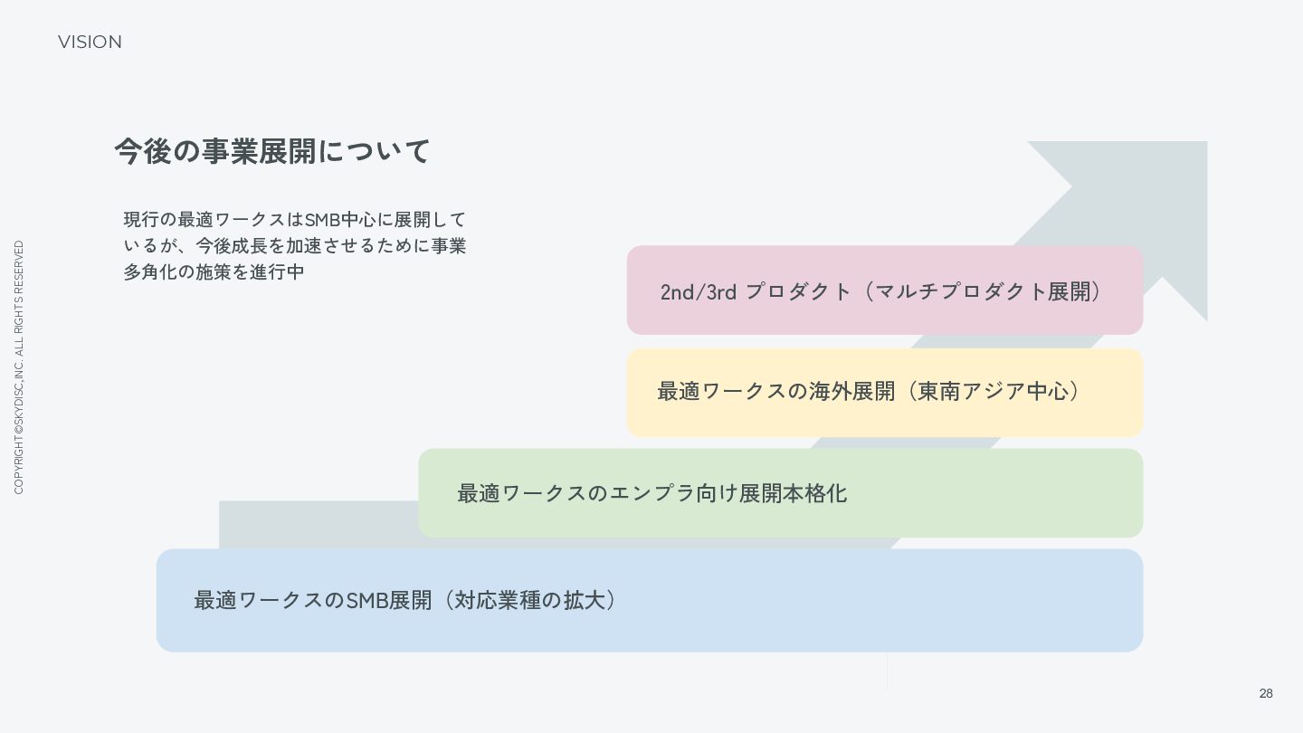 18. COPYRIGHT©SKYDISC,INC. ALL RIGHTS RESERVED 28 VISION 今後の事業展開について 現行の最適ワークスはSMB中心に展開して いるが、今後成長を加速させるために事業 多角化の施策を進行中