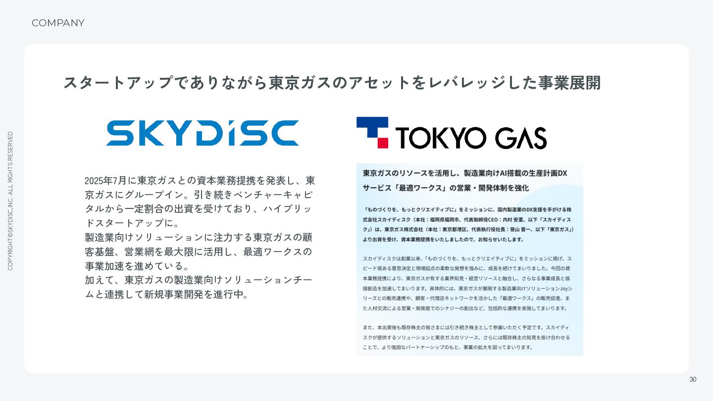 20. COPYRIGHT©SKYDISC,INC. ALL RIGHTS RESERVED 30 COMPANY スタートアップでありながら東京ガスのアセットをレバレッジした事業展開 2025年7月に東京ガスとの資本業務提携を発表し、東 京ガスにグループイン。引き続きベンチャーキャピ タルから一定割合の出資を受けており、ハイブリッ