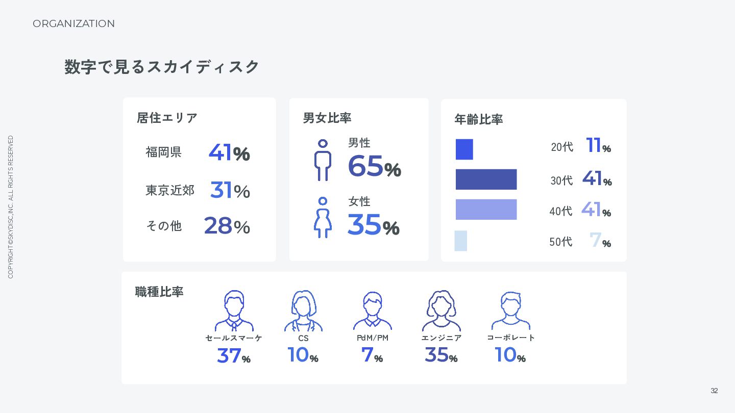 21. COPYRIGHT©SKYDISC,INC. ALL RIGHTS RESERVED 32 ORGANIZATION 数字で見るスカイディスク 居住エリア 男女比率 年齢比率