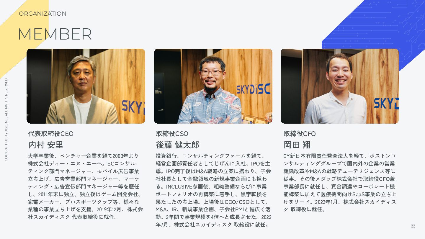 22. COPYRIGHT©SKYDISC,INC. ALL RIGHTS RESERVED 33 33 MEMBER 代表取締役CEO 内村 安里
