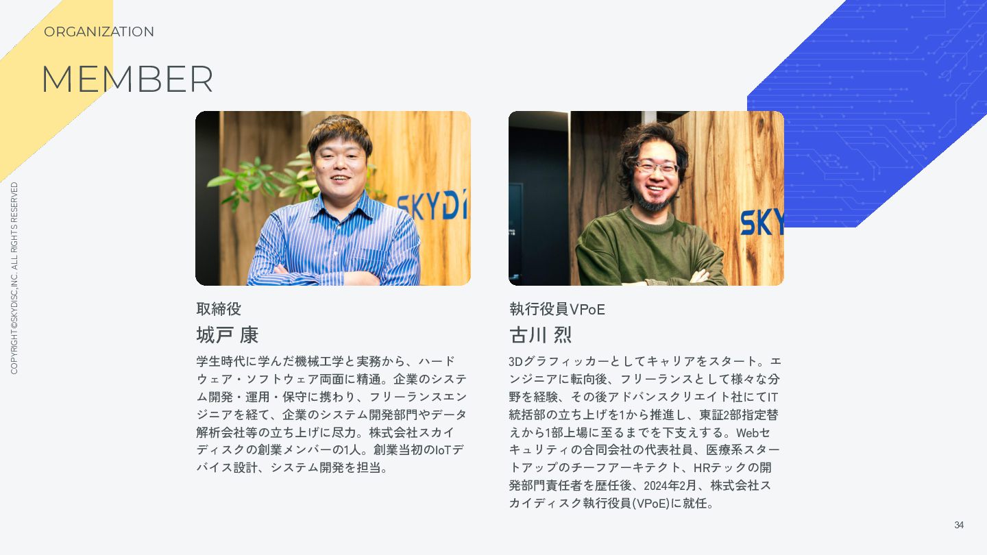 23. COPYRIGHT©SKYDISC,INC. ALL RIGHTS RESERVED 34 34 取締役 城戸 康 学生時代に学んだ機械工学と実務から、ハード