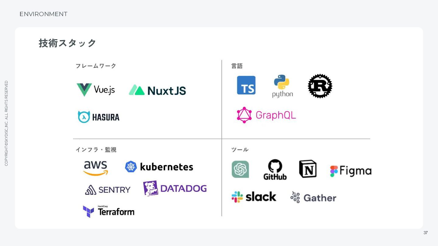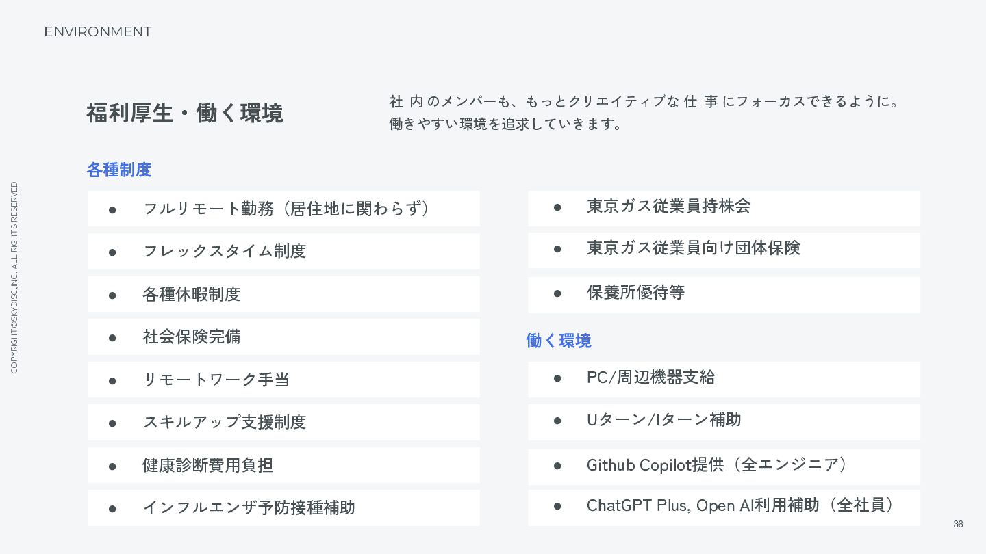 にフォーカスできるように。 働きやすい環境を追求していきます。 ENVIRONMENT 福利厚生・働く環境 各種制度 働く環境 • PC/周辺機器支給 • Uターン/Iターン補助 • Github Copilot提供(全エンジニア) • ChatGPT Plus, Open AI利用補助(全社員) • フルリモート勤務(居住地に関わらず) • フレックスタイム制度 • 各種休暇制度 • 社会保険完備 • リモートワーク手当 • スキルアップ支援制度 • 健康診断費用負担 • 東京ガス従業員持株会 • 東京ガス従業員向け団体保険 • 保養所優待等 • インフルエンザ予防接種補助