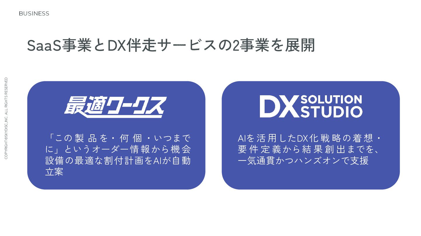 4. COPYRIGHT©SKYDISC,INC. ALL RIGHTS RESERVED 6 BUSINESS SaaS事業とDX伴走サービスの2事業を展開 「この 製 品