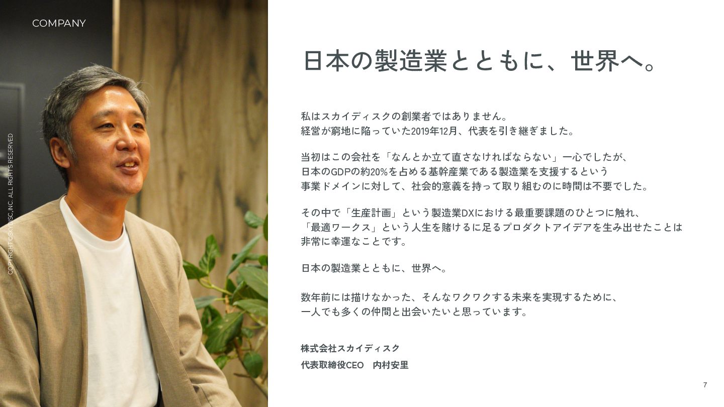 5. COPYRIGHT©SKYDISC,INC. ALL RIGHTS RESERVED 7 私はスカイディスクの創業者ではありません。 経営が窮地に陥っていた2019年12月、代表を引き継ぎました。 当初はこの会社を「なんとか立て直さなければならない」一心でしたが、 日本のGDPの約20%を占める基幹産業である製造業を支援するという 事業ドメインに対して、社会的意義を持って取り組むのに時間は不要でした。