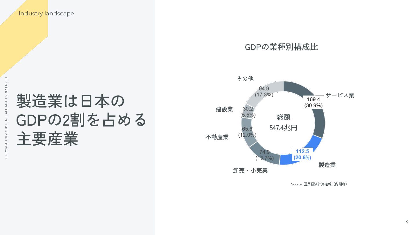 6. COPYRIGHT©SKYDISC,INC. ALL RIGHTS RESERVED 9 9 製造業は日本の GDPの2割を占める 主要産業 Industry