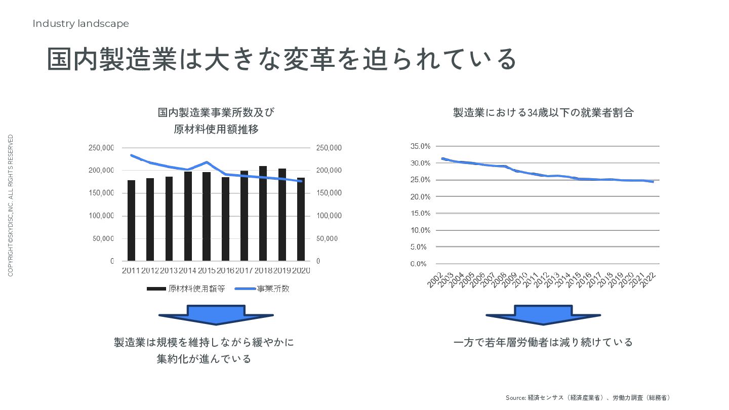 7. COPYRIGHT©SKYDISC,INC. ALL RIGHTS RESERVED Industry landscape 国内製造業は大きな変革を迫られている 国内製造業事業所数及び 原材料使用額推移 製造業における34歳以下の就業者割合