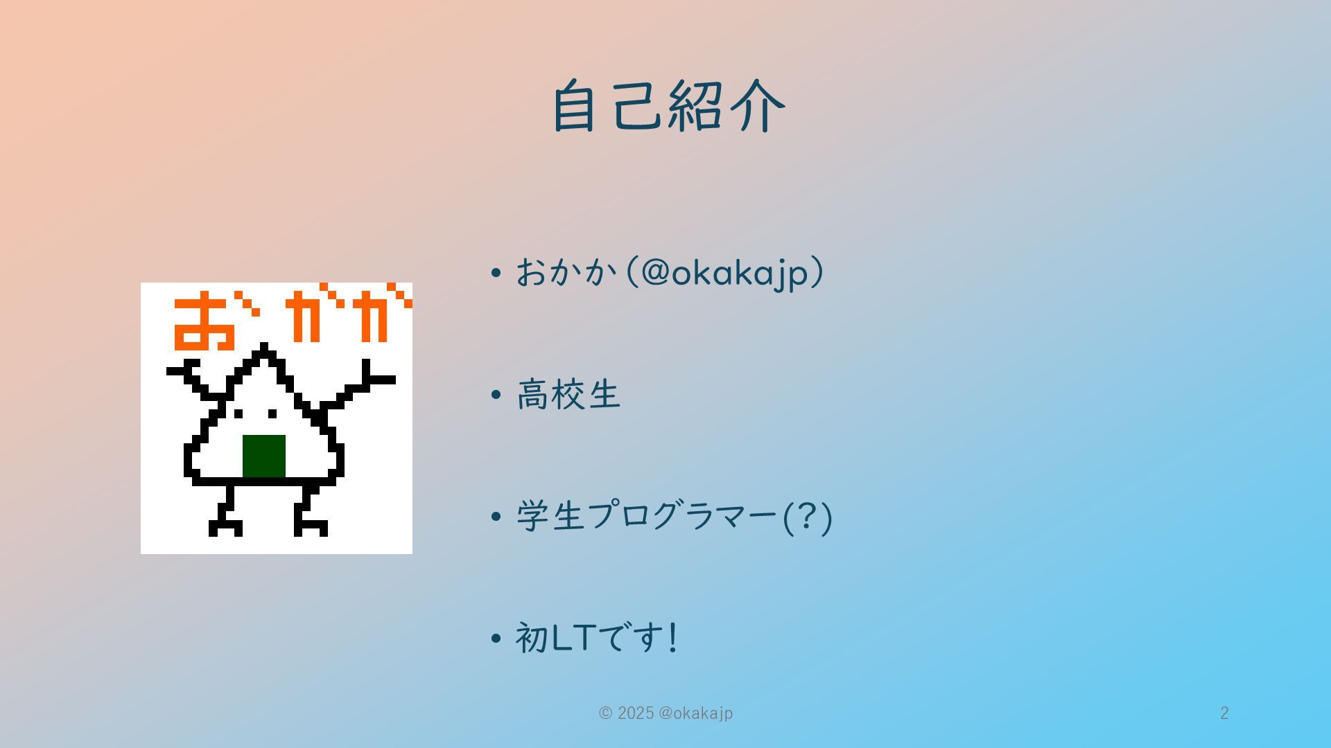自己紹介 • おかか(@okakajp) • 高校生 • 学生プログラマー(?) • 初LTです! 2