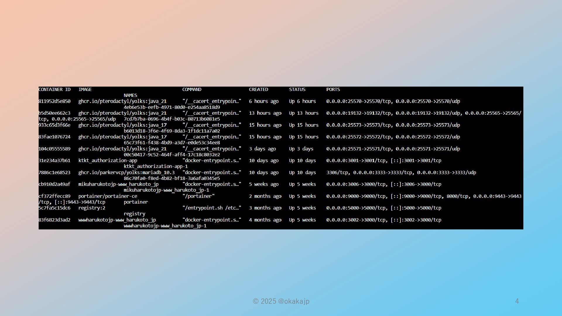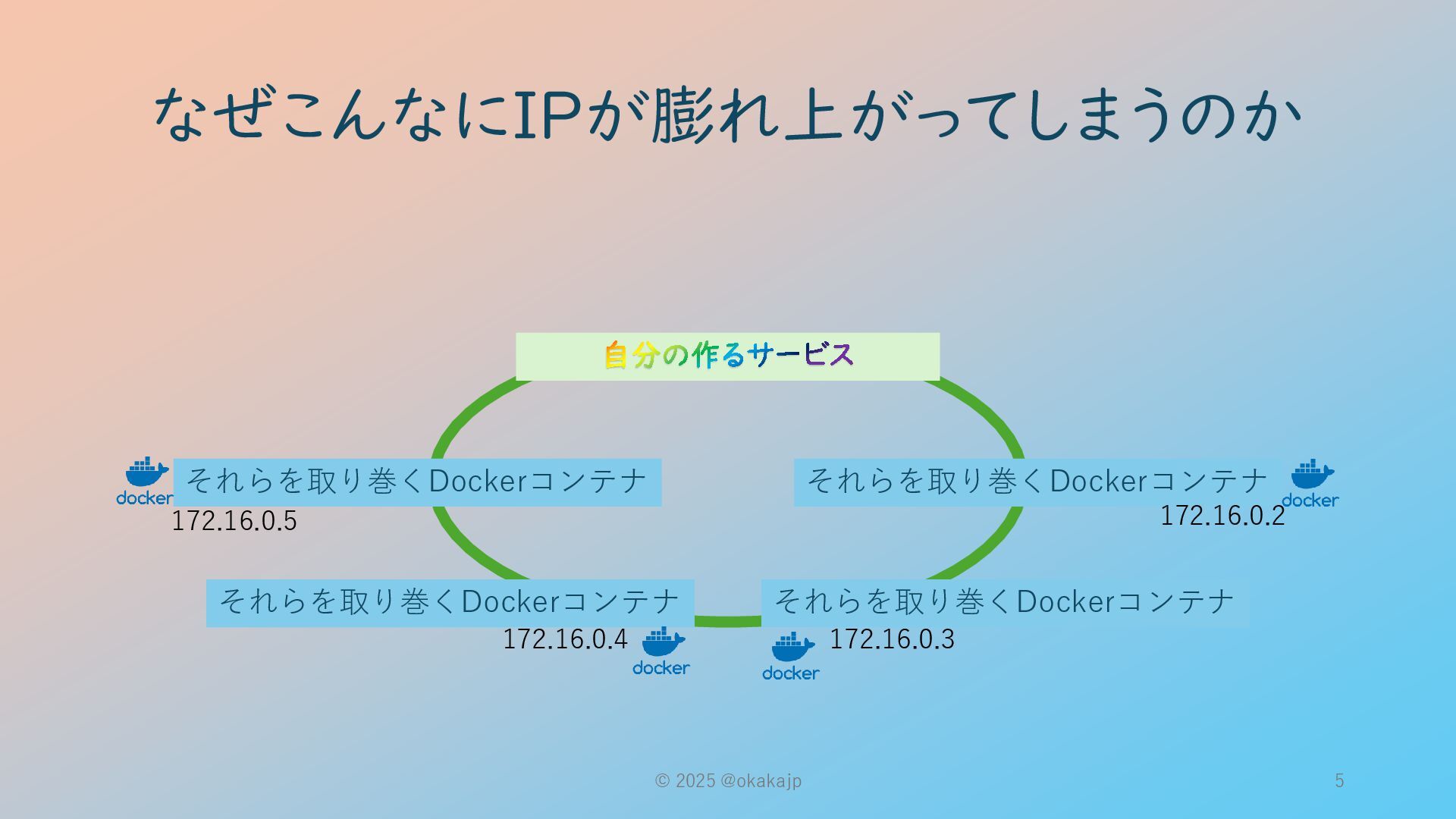 なぜこんなにIPが膨れ上がってしまうのか © 2025 @okakajp 5 それらを取り巻くDockerコンテナ それらを取り巻くDockerコンテナ それらを取り巻くDockerコンテナ それらを取り巻くDockerコンテナ 自分の作るサービス