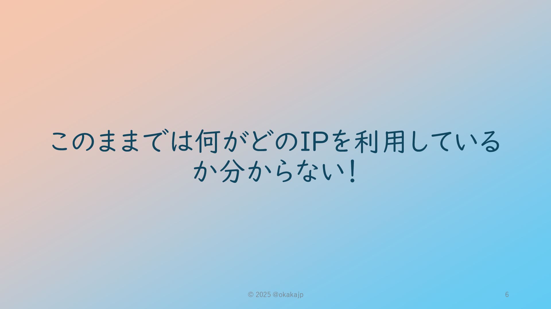 このままでは何がどのIPを利用している か分からない! © 2025 @okakajp 6