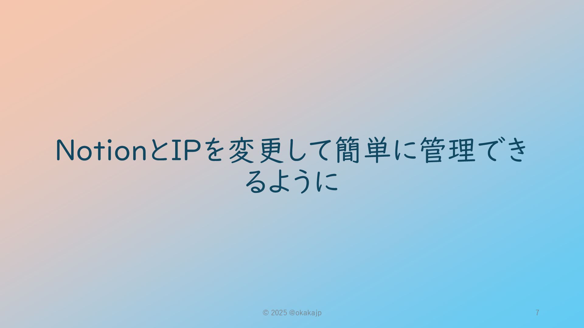 NotionとIPを変更して簡単に管理でき るように © 2025 @okakajp 7