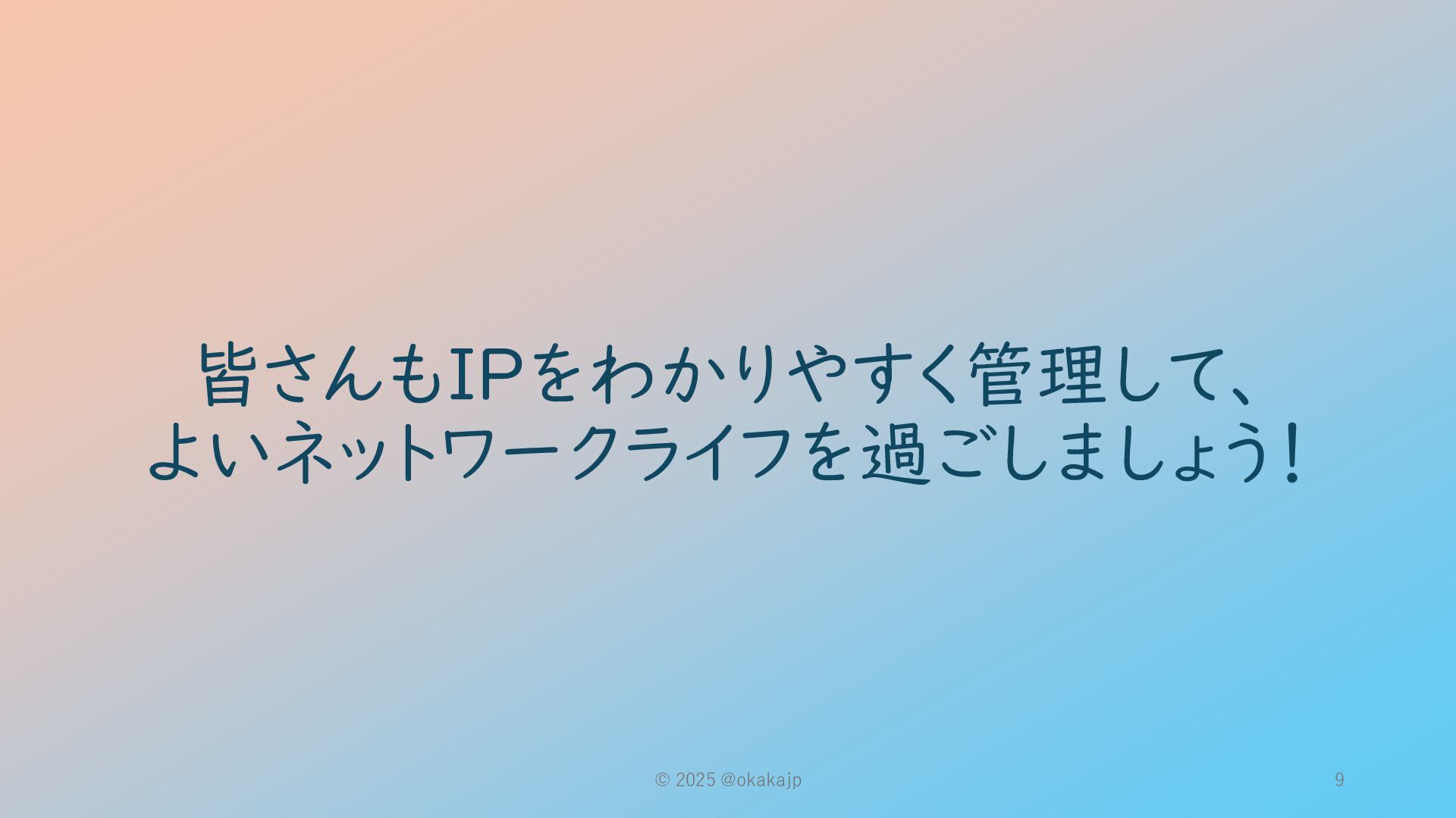皆さんもIPをわかりやすく管理して、 よいネットワークライフを過ごしましょう! © 2025 @okakajp 9