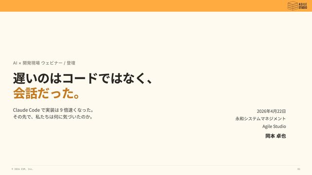 で実装は 9 倍速くなった。 その先で、私たちは何に気づいたのか。 2026年4月22日 永和システムマネジメント Agile Studio 岡本 卓也 © 2026 ESM, Inc. 01