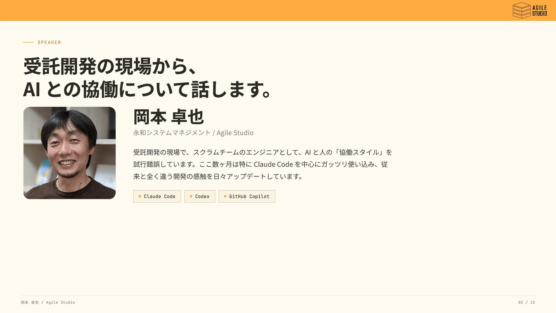 受託開発の現場で、スクラムチームのエンジニアとして、AI と人の「協働スタイル」を 試行錯誤しています。ここ数ヶ月は特に Claude Code を中心にガッツリ使い込み、従 来と全く違う開発の感触を日々アップデートしています。 Claude Code Codex GitHub Copilot 岡本 卓也 / Agile Studio 02 / 15