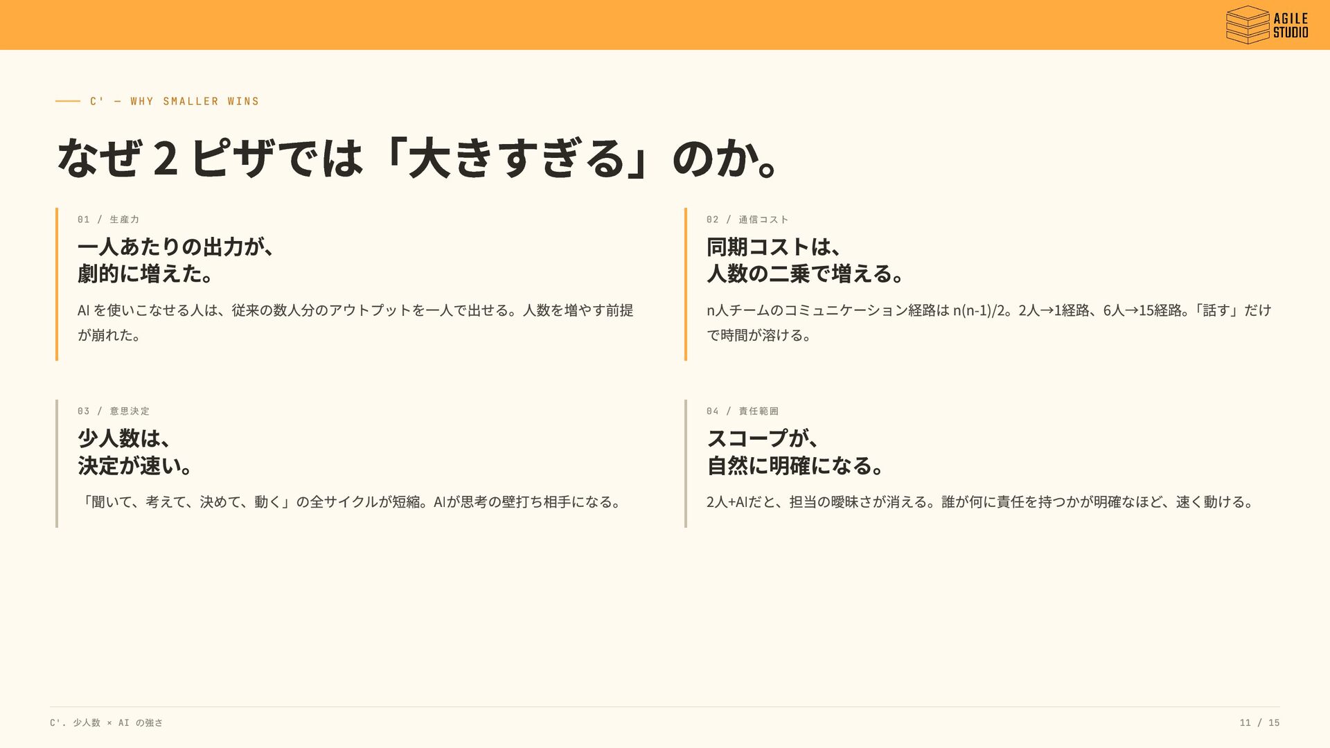 生産力 一人あたりの出力が、 劇的に増えた。 AI を使いこなせる人は、従来の数人分のアウトプットを一人で出せる。人数を増やす前提 が崩れた。 02 / 通信コスト 同期コストは、 人数の二乗で増える。 n人チームのコミュニケーション経路は n(n-1)/2。2人→1経路、6人→15経路。 「話す」だけ で時間が溶ける。 03 / 意思決定 少人数は、 決定が速い。 「聞いて、考えて、決めて、動く」の全サイクルが短縮。AIが思考の壁打ち相手になる。 04 / 責任範囲 スコープが、 自然に明確になる。 2人+AIだと、担当の曖昧さが消える。誰が何に責任を持つかが明確なほど、速く動ける。 C'. 少人数 × AI の強さ 11 / 15