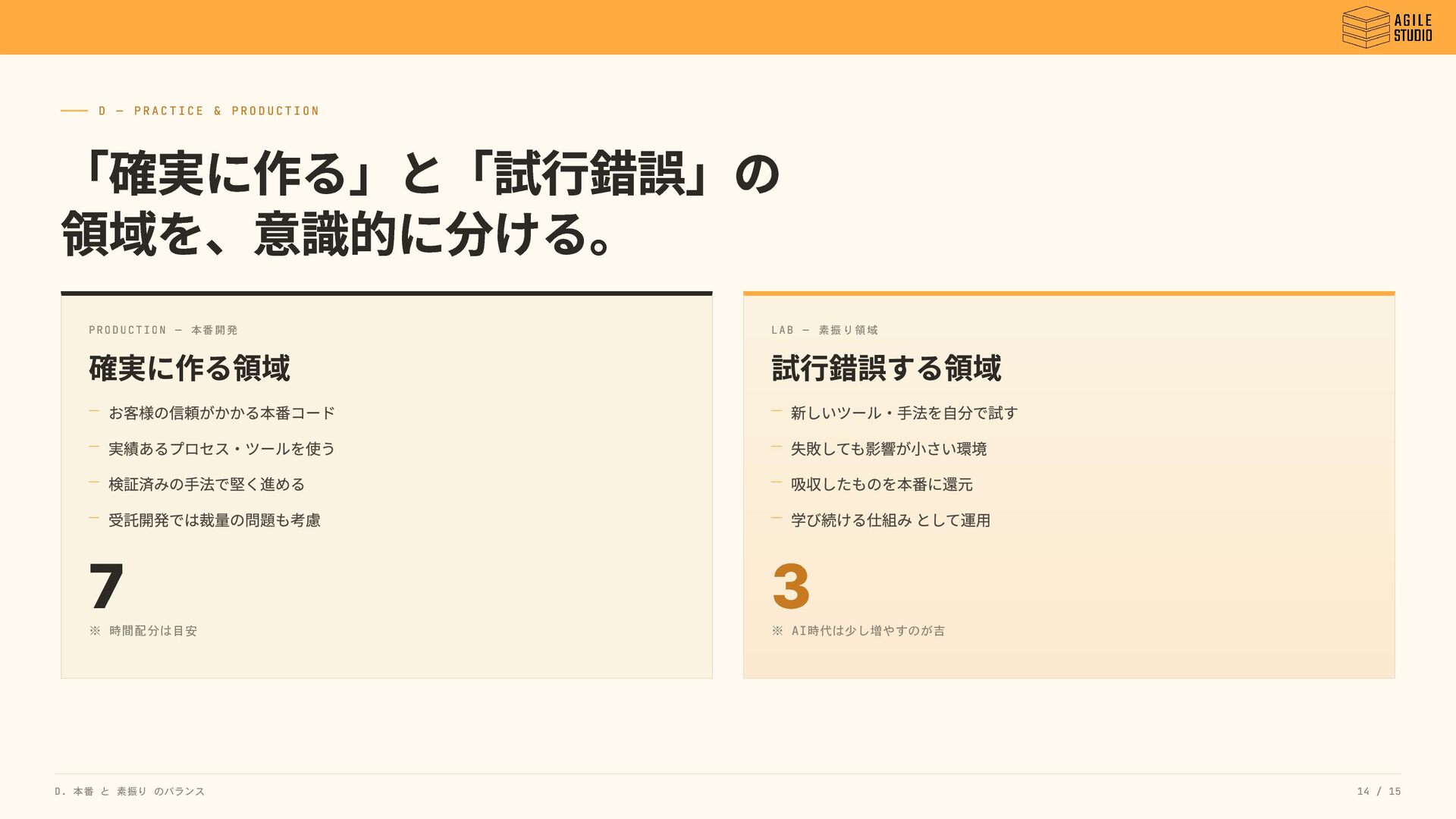 D — PRACTICE & PRODUCTIO N 「確実に作る」と「試行錯誤」の 領域を、意識的に分ける。 PRODUCTION —
