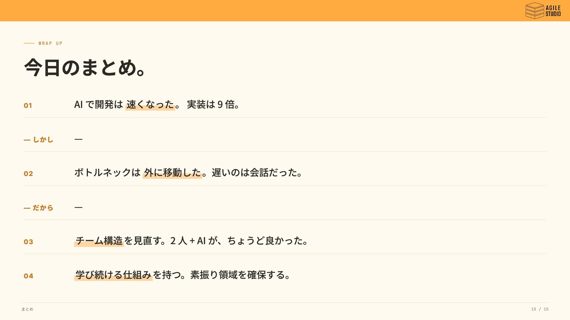 — しかし — 02 ボトルネックは 外に移動した。遅いのは会話だった。 — だから — 03 チーム構造を見直す。2 人 + AI が、ちょうど良かった。 04 学び続ける仕組みを持つ。素振り領域を確保する。 まとめ 15 / 15