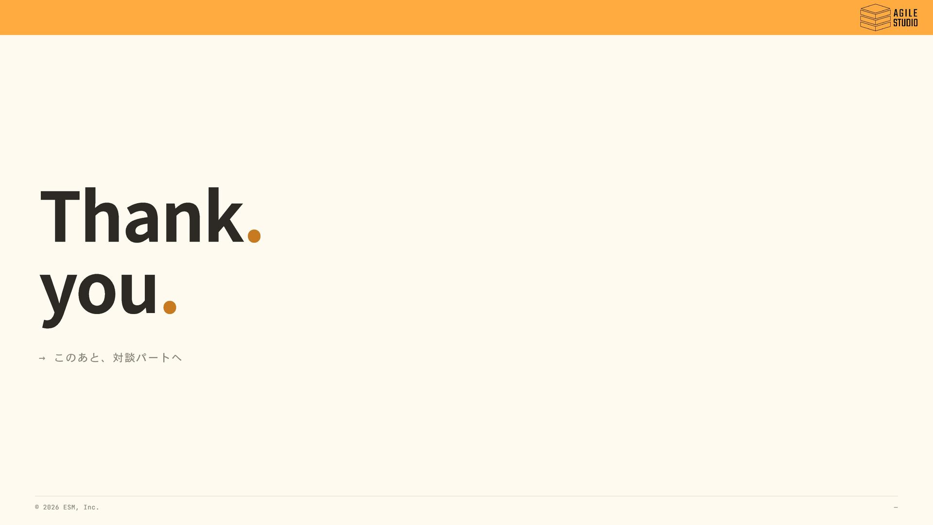 Thank. you. → このあと、対談パートへ © 2026 ESM, Inc. —