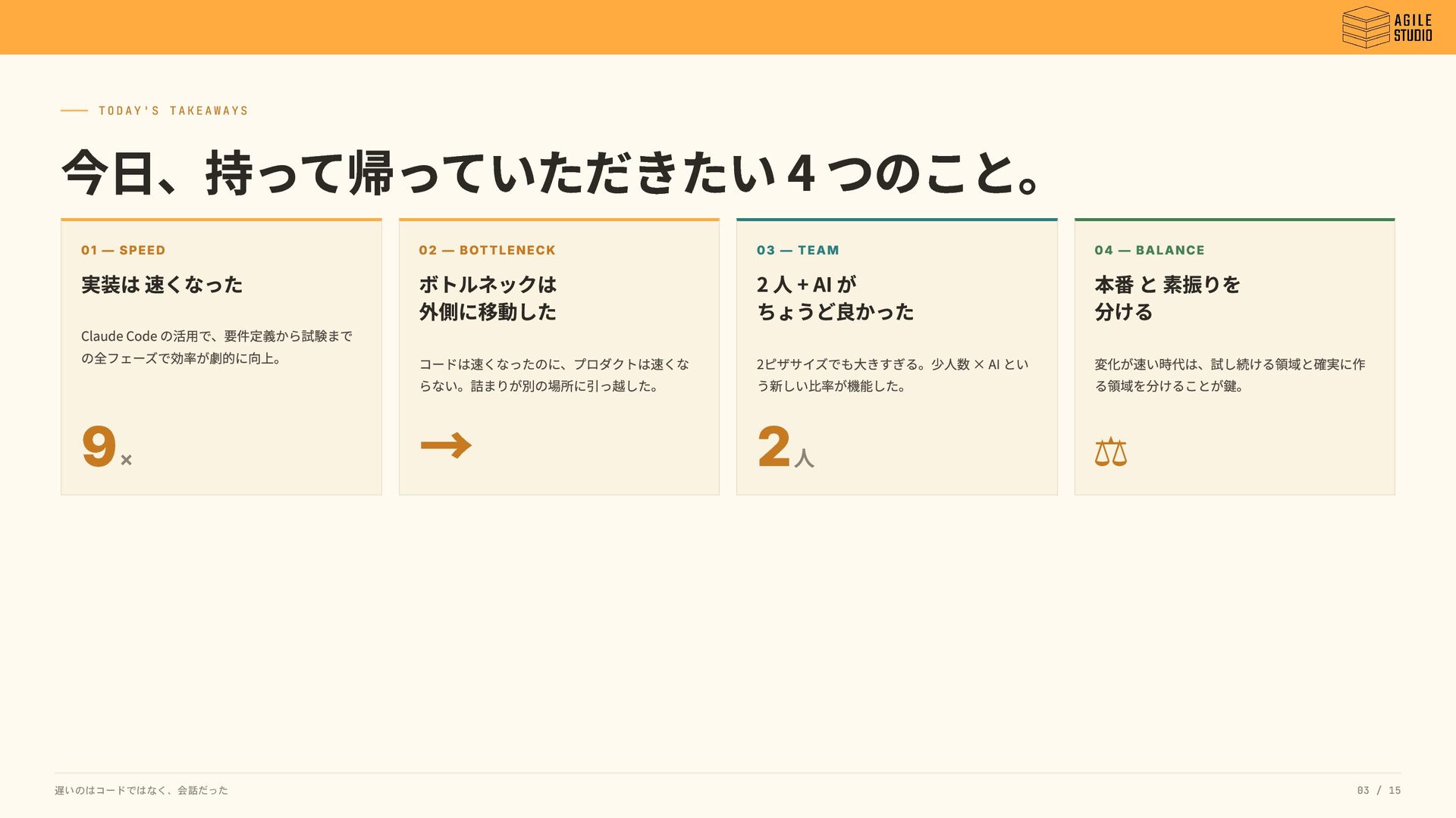 Claude Code の活用で、要件定義から試験まで の全フェーズで効率が劇的に向上。 9× 02 — BOTTLENECK ボトルネックは 外側に移動した コードは速くなったのに、プロダクトは速くな らない。詰まりが別の場所に引っ越した。 → 03 — TEAM 2 人 + AI が ちょうど良かった 2ピザサイズでも大きすぎる。少人数 × AI とい う新しい比率が機能した。 2人 04 — BALANCE 本番 と 素振りを 分ける 変化が速い時代は、試し続ける領域と確実に作 る領域を分けることが鍵。 ⚖ 遅いのはコードではなく、会話だった 03 / 15