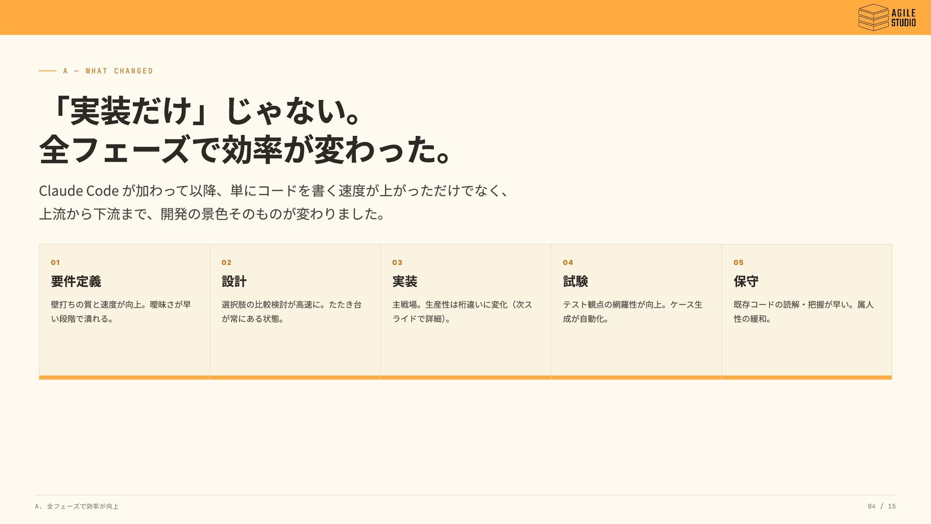 A — WHAT CHANGED 「実装だけ」じゃない。 全フェーズで効率が変わった。 Claude Code が加わって以降、単にコードを書く速度が上がっただけでなく、 上流から下流まで、開発の景色そのものが変わりました。