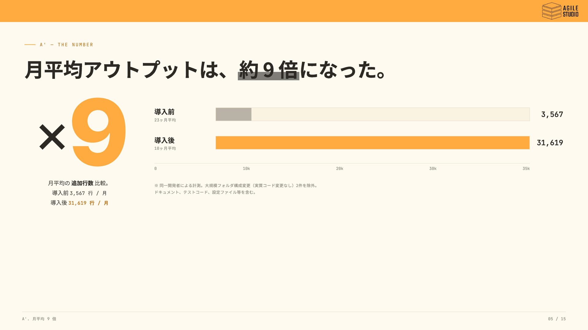 比較。 導入前 3,567 行 / 月 導入後 31,619 行 / 月 導入前 23ヶ月平均 導入後 10ヶ月平均 0 10k 20k 30k 35k ※ 同一開発者による計測。大規模フォルダ構成変更(実質コード変更なし)2件を除外。 ドキュメント、テストコード、設定ファイル等を含む。 × 3,567 31,619 A'. 月平均 9 倍 05 / 15