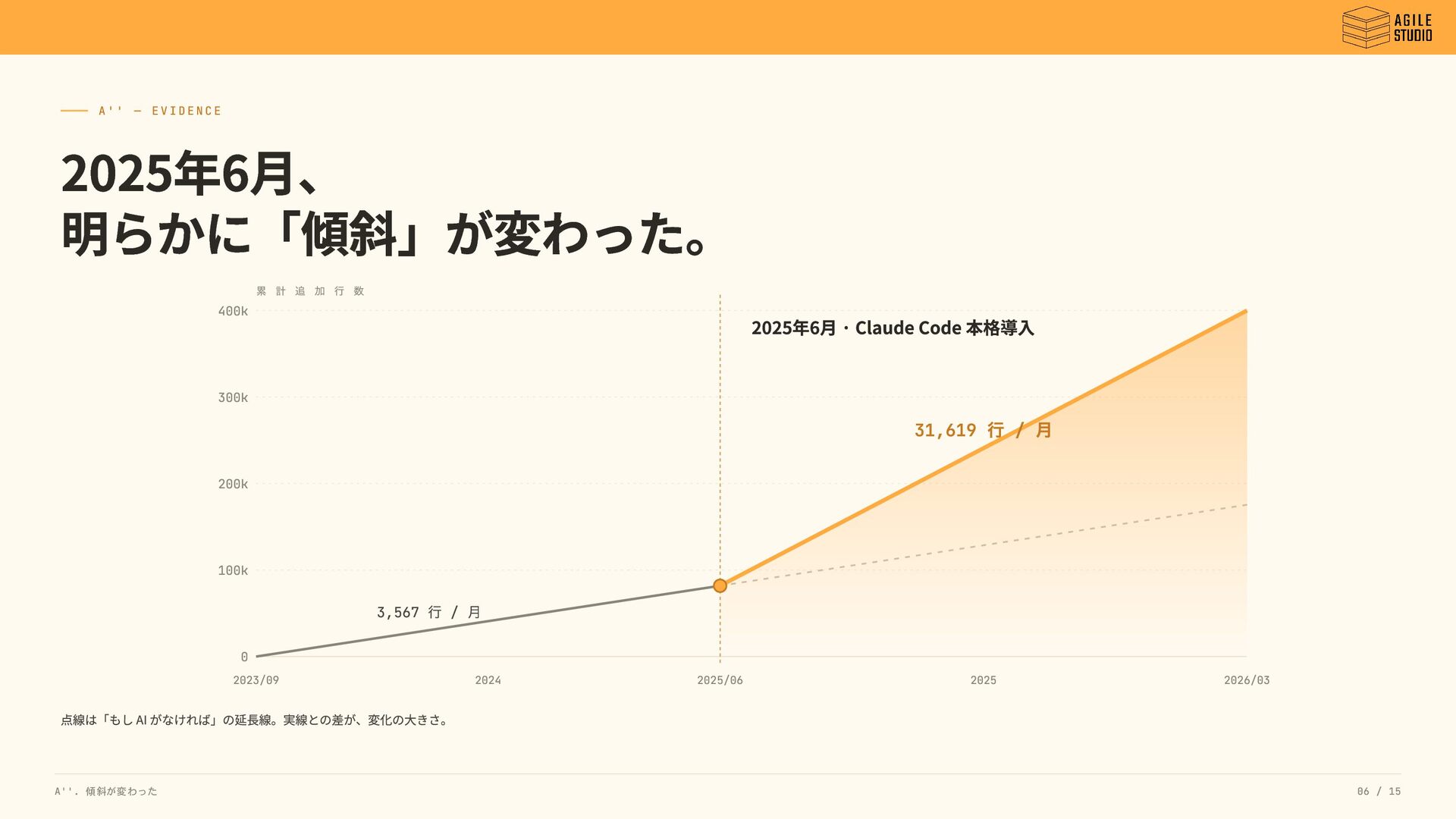 2025年6月 · Claude Code 本格導入 3,567 行 / 月 31,619 行 / 月 2023/09 2024 2025/06 2025 2026/03 累 計 追 加 行 数 点線は「もし AI がなければ」の延長線。実線との差が、変化の大きさ。 A''. 傾斜が変わった 06 / 15