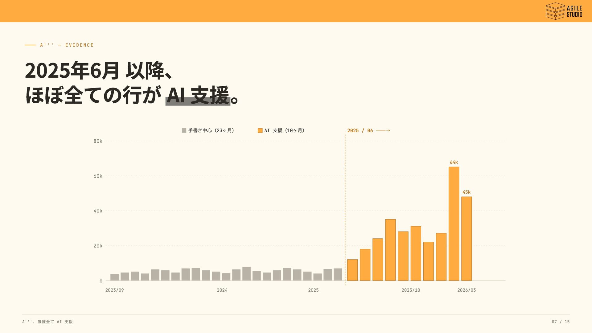 40k 60k 80k 64k 45k 手書き中心(23 ヶ月) AI 支援(10 ヶ月) 2025 / 06 ──→ 2023/09 2024 2025 2025/10 2026/03 A'''. ほぼ全て AI 支援 07 / 15