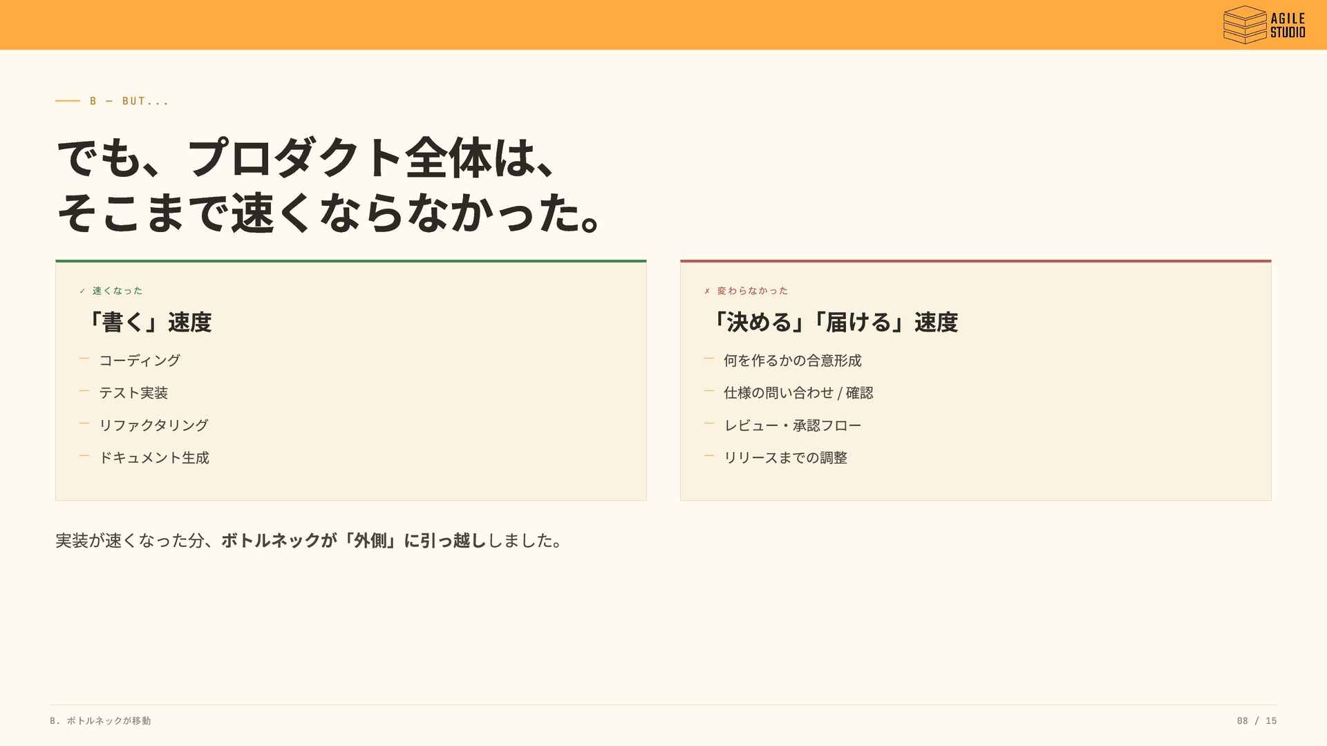 B — BUT... でも、プロダクト全体は、 そこまで速くならなかった。 ✓ 速くなった 「書く」速度 ✗ 変わらなかった