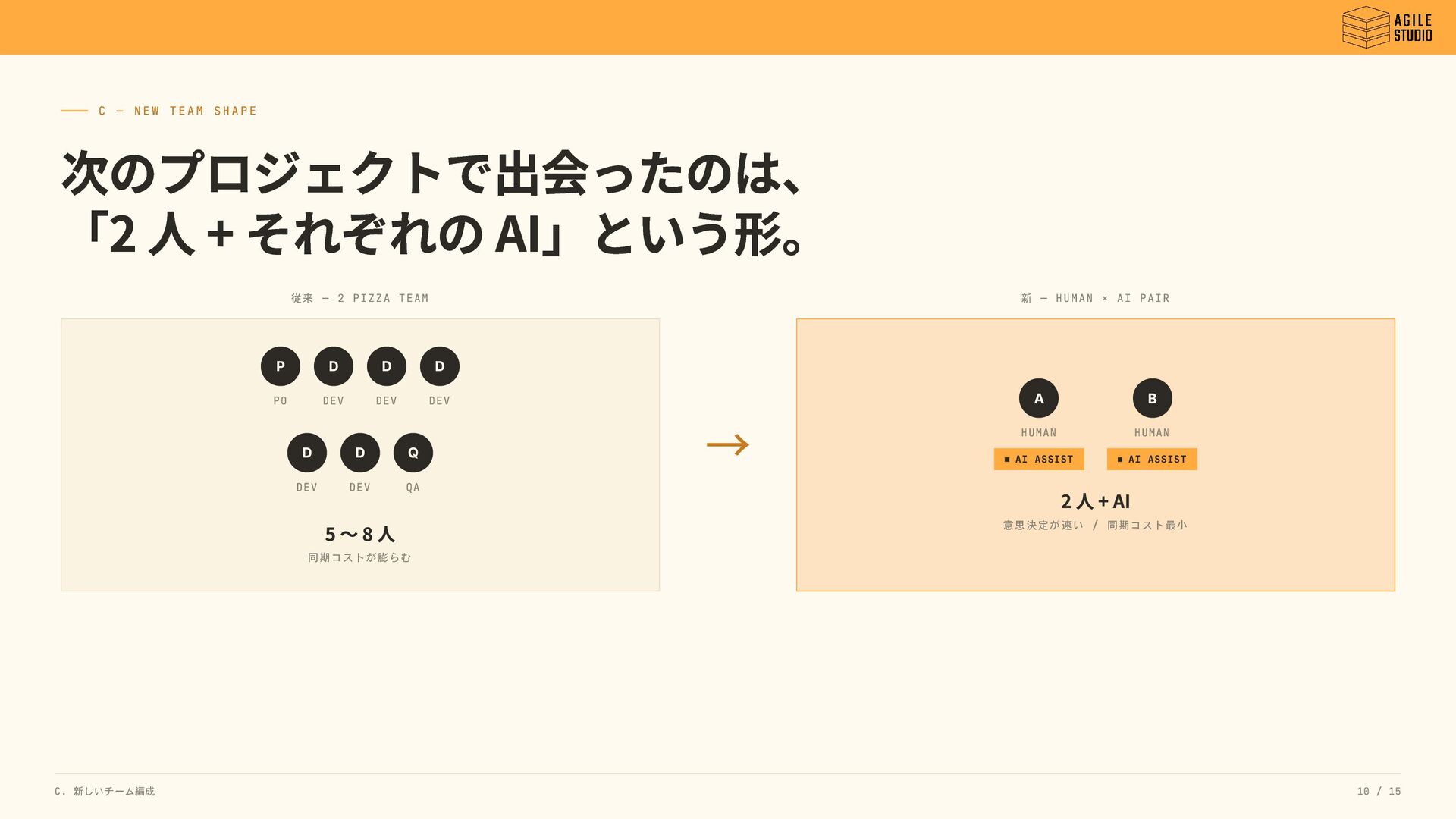 AI」という形。 従来 — 2 PIZZA TEAM P PO D DEV D DEV D DEV D DEV D DEV Q QA 5 〜 8 人 同期コストが膨らむ → 新 — HUMAN × AI PAIR A HUMAN AI ASSIST B HUMAN AI ASSIST 2 人 + AI 意思決定が速い / 同期コスト最小 C. 新しいチーム編成 10 / 15