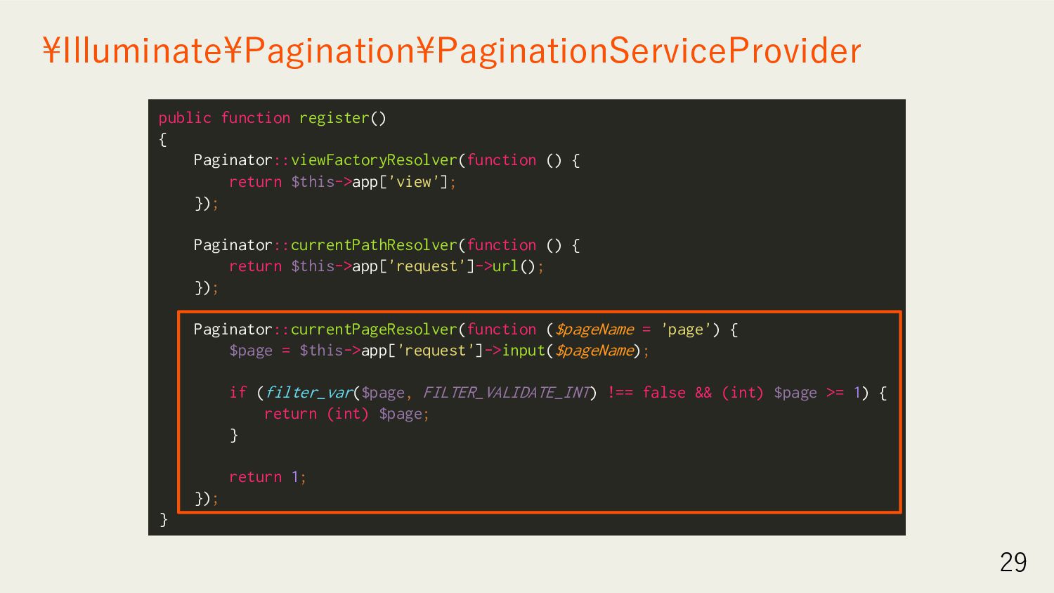 29 ¥Illuminate¥Pagination¥PaginationServiceProvider public function register() { Paginator::viewFactoryResolver(function () { return