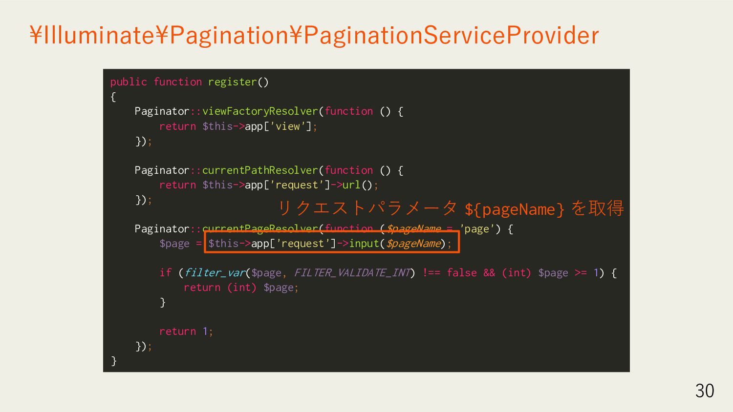 $this->app['view']; }); Paginator::currentPathResolver(function () { return $this->app['request']->url(); }); Paginator::currentPageResolver(function ($pageName = 'page') { $page = $this->app['request']->input($pageName); if (filter_var($page, FILTER_VALIDATE_INT) !== false && (int) $page >= 1) { return (int) $page; } return 1; }); } リクエストパラメータ ${pageName} を取得