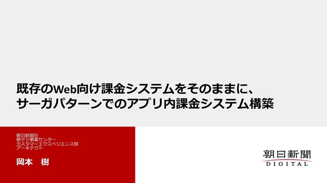 既存のWeb向け課⾦システムをそのままに、 サーガパターンでのアプリ内課⾦システム構築 朝⽇新聞社 朝デジ事業センター カスタマーエクスペリエンス部 アーキテクト 岡本 樹