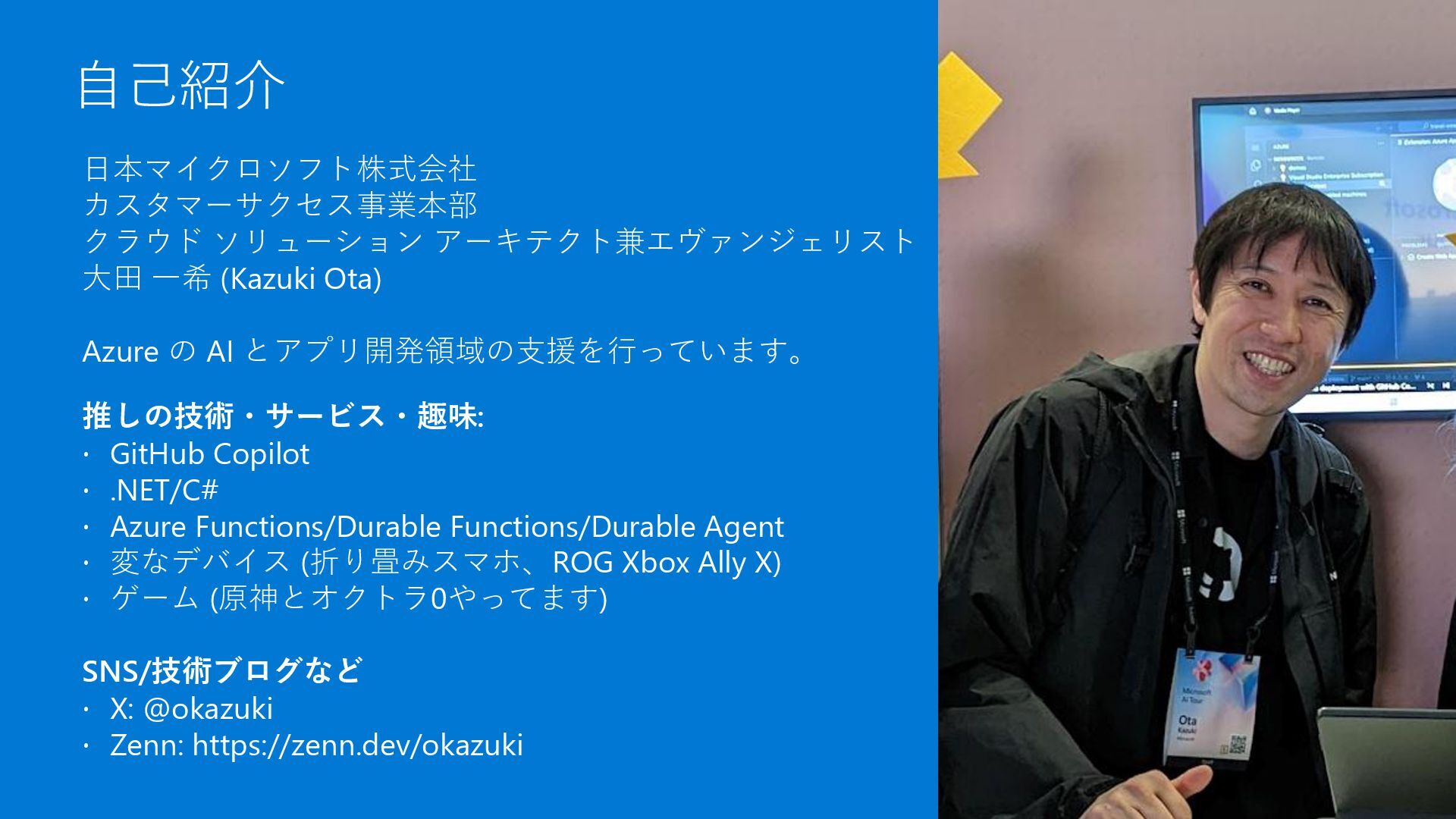 自己紹介 日本マイクロソフト株式会社 カスタマーサクセス事業本部 クラウド ソリューション アーキテクト兼エヴァンジェリスト 大田 一希 (Kazuki Ota)