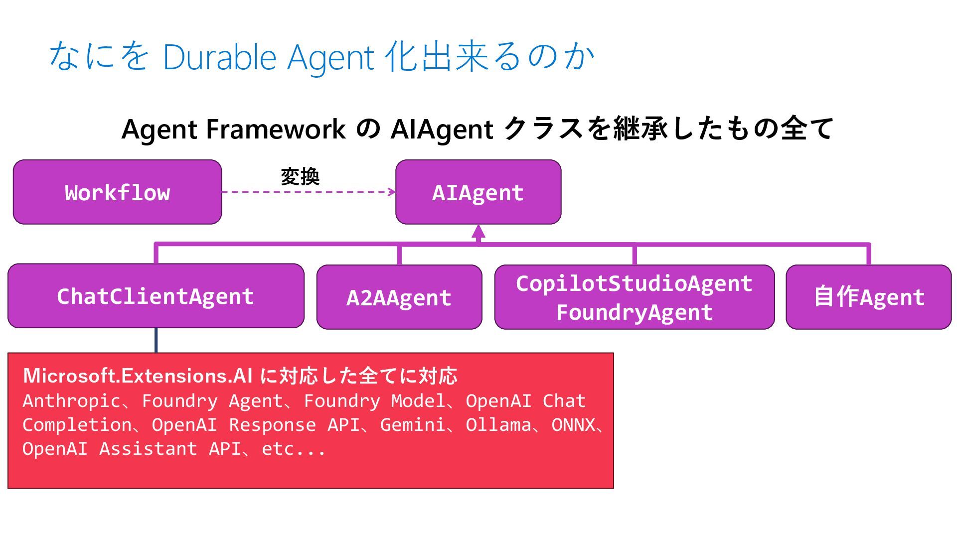 なにを Durable Agent 化出来るのか Agent Framework の AIAgent クラスを継承したもの全て AIAgent