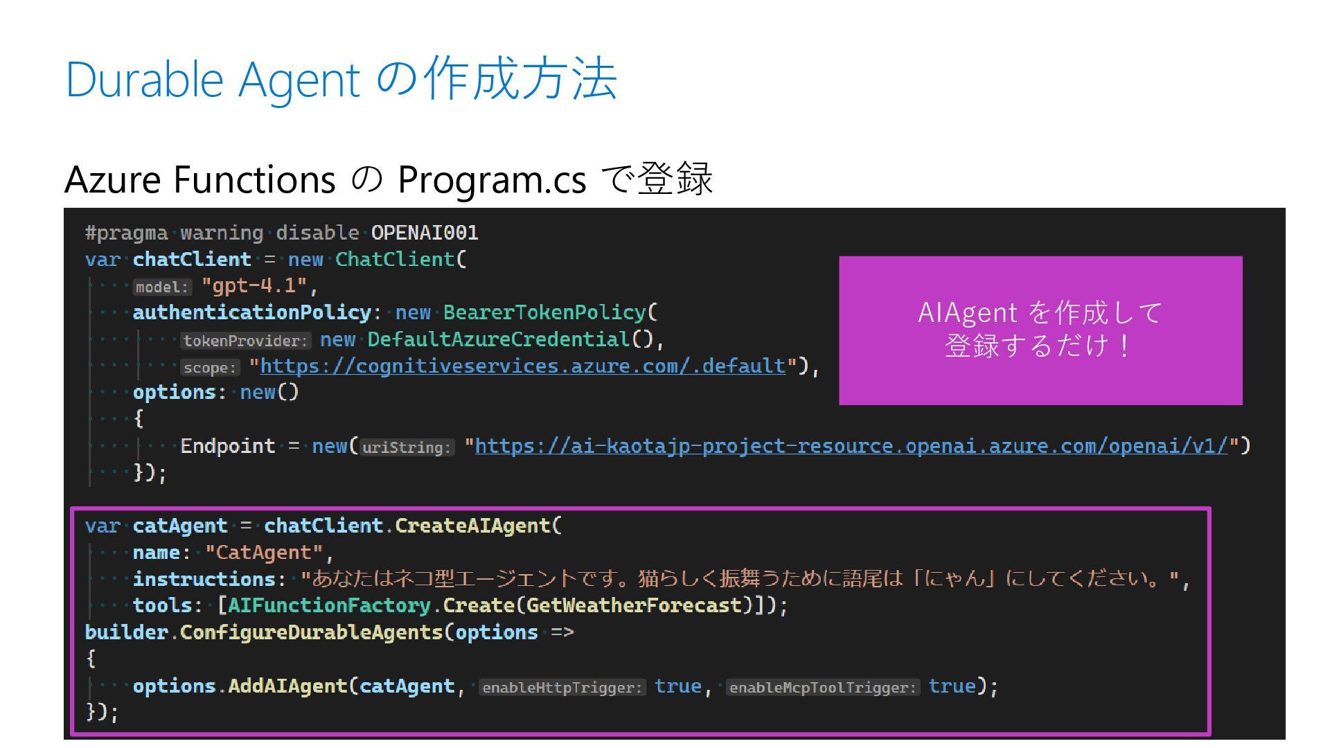Durable Agent の作成方法 Azure Functions の Program.cs で登録 AIAgent を作成して