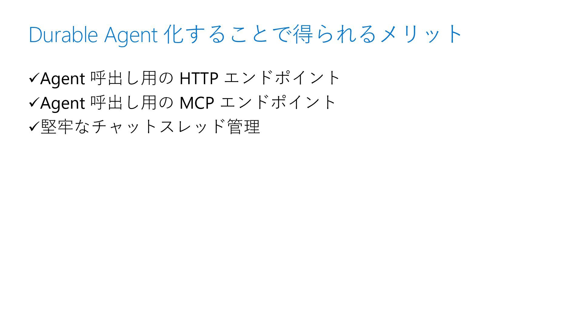 Durable Agent 化することで得られるメリット ✓Agent 呼出し用の HTTP エンドポイント ✓Agent 呼出し用の MCP