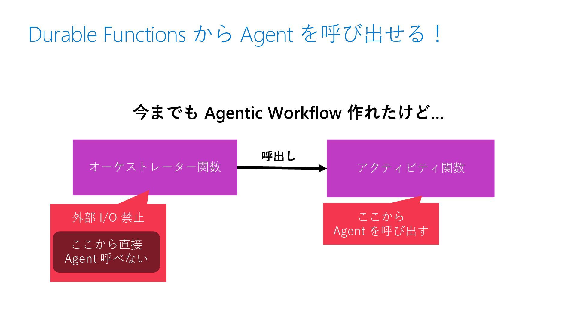 アクティビティ関数 外部 I/O 禁止 ここから直接 Agent 呼べない ここから Agent を呼び出す 呼出し