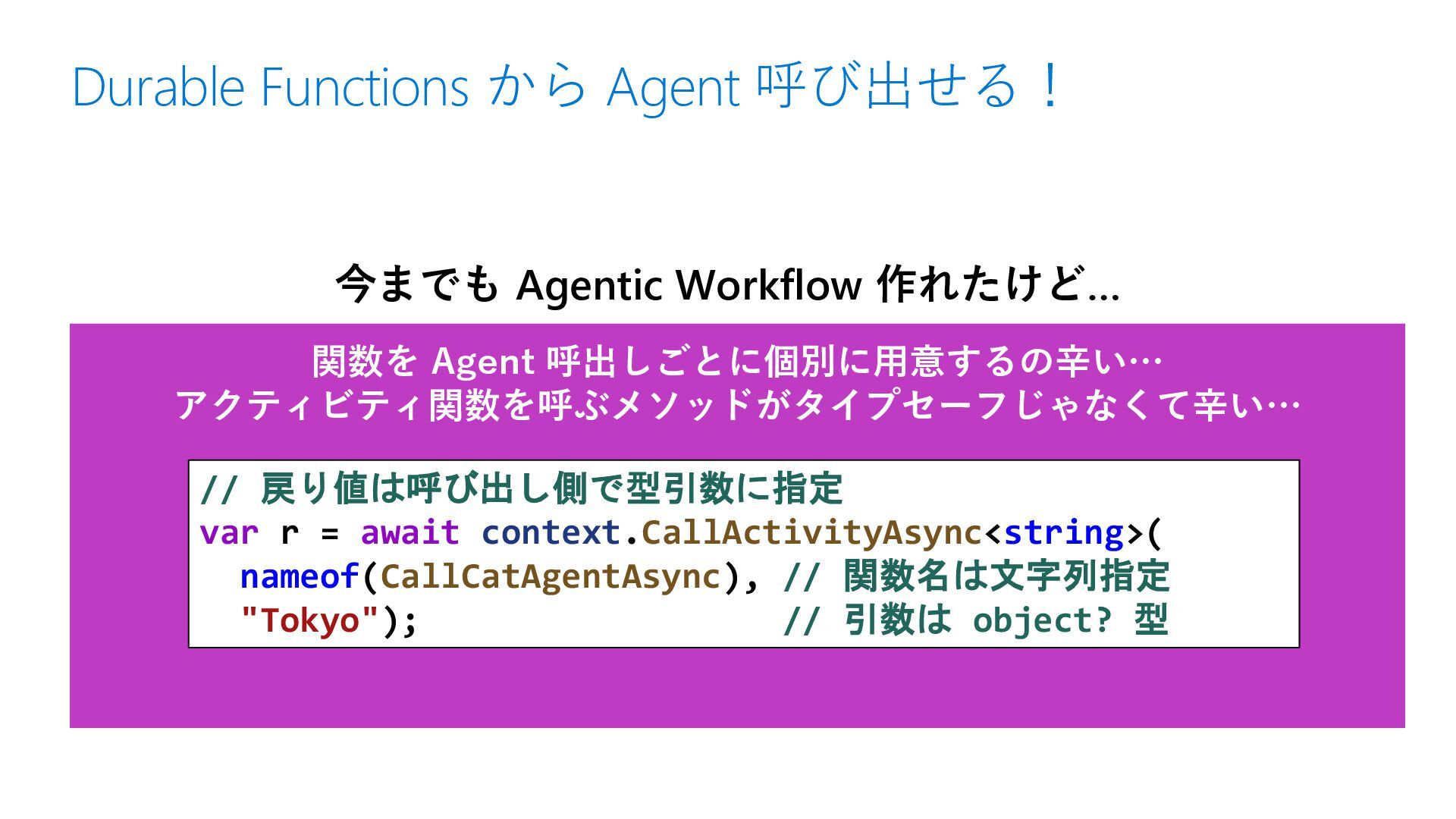アクティビティ関数 外部 I/O 禁止 ここから直接 Agent 呼べない ここから Agent を呼び出す 呼出し 関数を Agent 呼出しごとに個別に用意するの辛い… アクティビティ関数を呼ぶメソッドがタイプセーフじゃなくて辛い… // 戻り値は呼び出し側で型引数に指定 var r = await context.CallActivityAsync<string>( nameof(CallCatAgentAsync), // 関数名は文字列指定 "Tokyo"); // 引数は object? 型