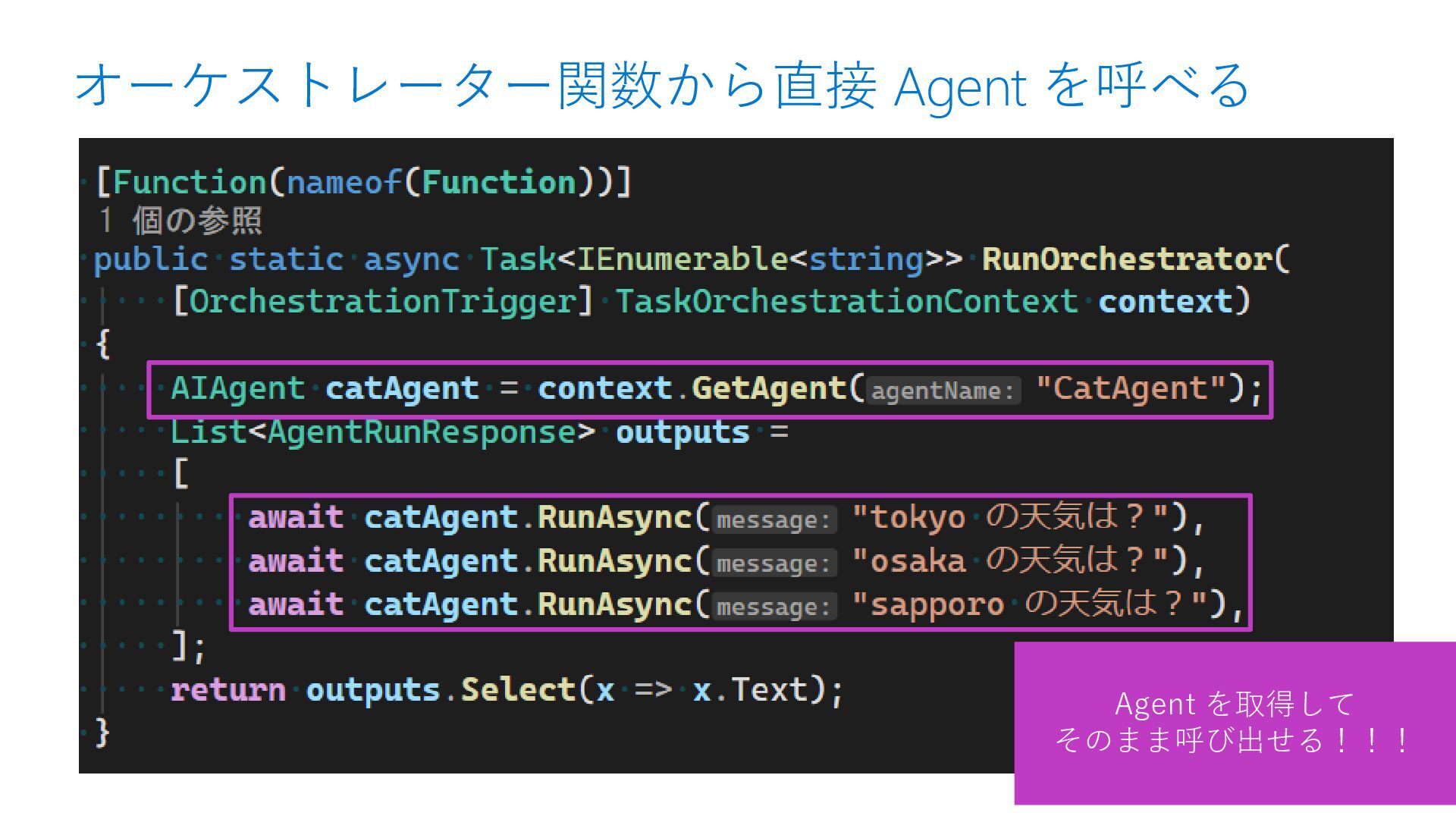 オーケストレーター関数から直接 Agent を呼べる Agent を取得して そのまま呼び出せる!!!
