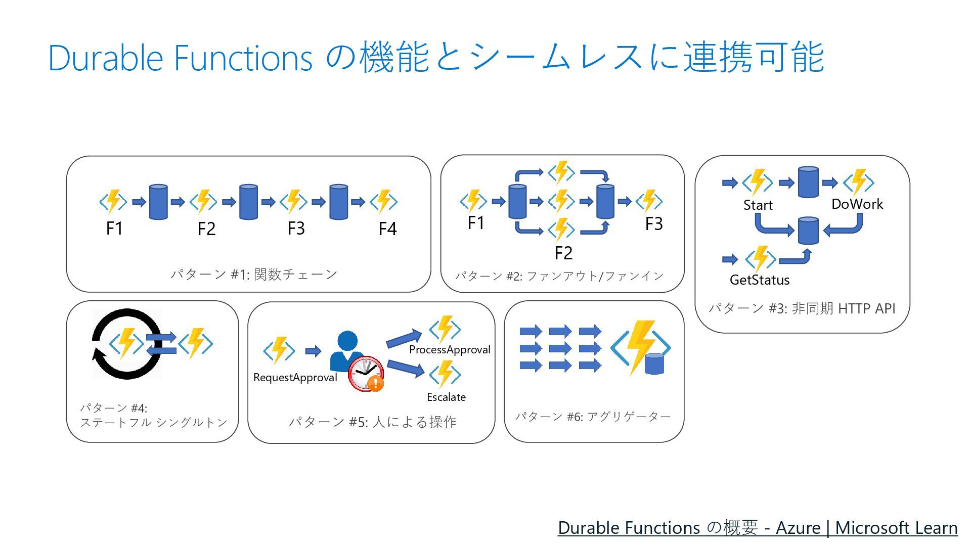 F1 F2 F3 パターン #2: ファンアウト/ファンイン Start DoWork GetStatus パターン #3: 非同期 HTTP API RequestApproval Escalate ProcessApproval パターン #5: 人による操作 パターン #4: ステートフル シングルトン パターン #6: アグリゲーター 超協力な Agentic Workflow 構築の 基盤として利用可能 Durable Functions の概要 - Azure | Microsoft Learn