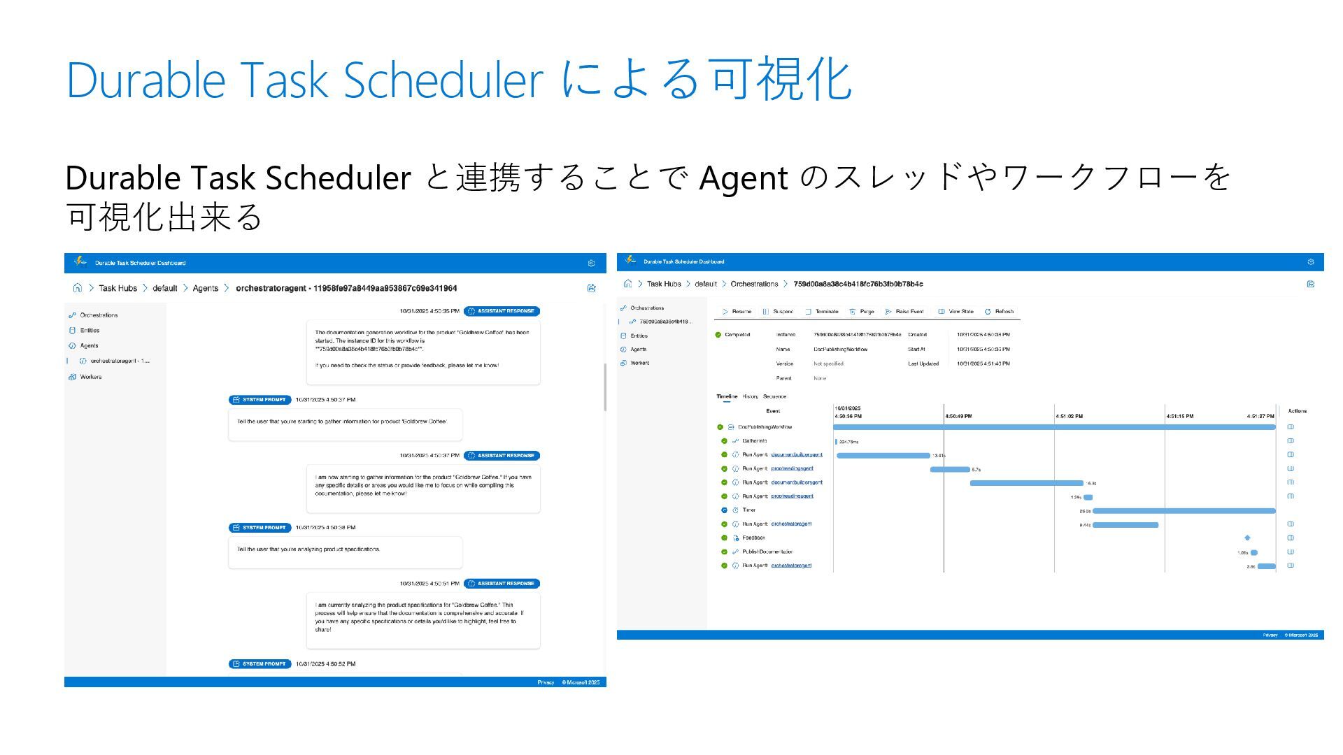 Durable Task Scheduler による可視化 Durable Task Scheduler と連携することで Agent のスレッドやワークフローを