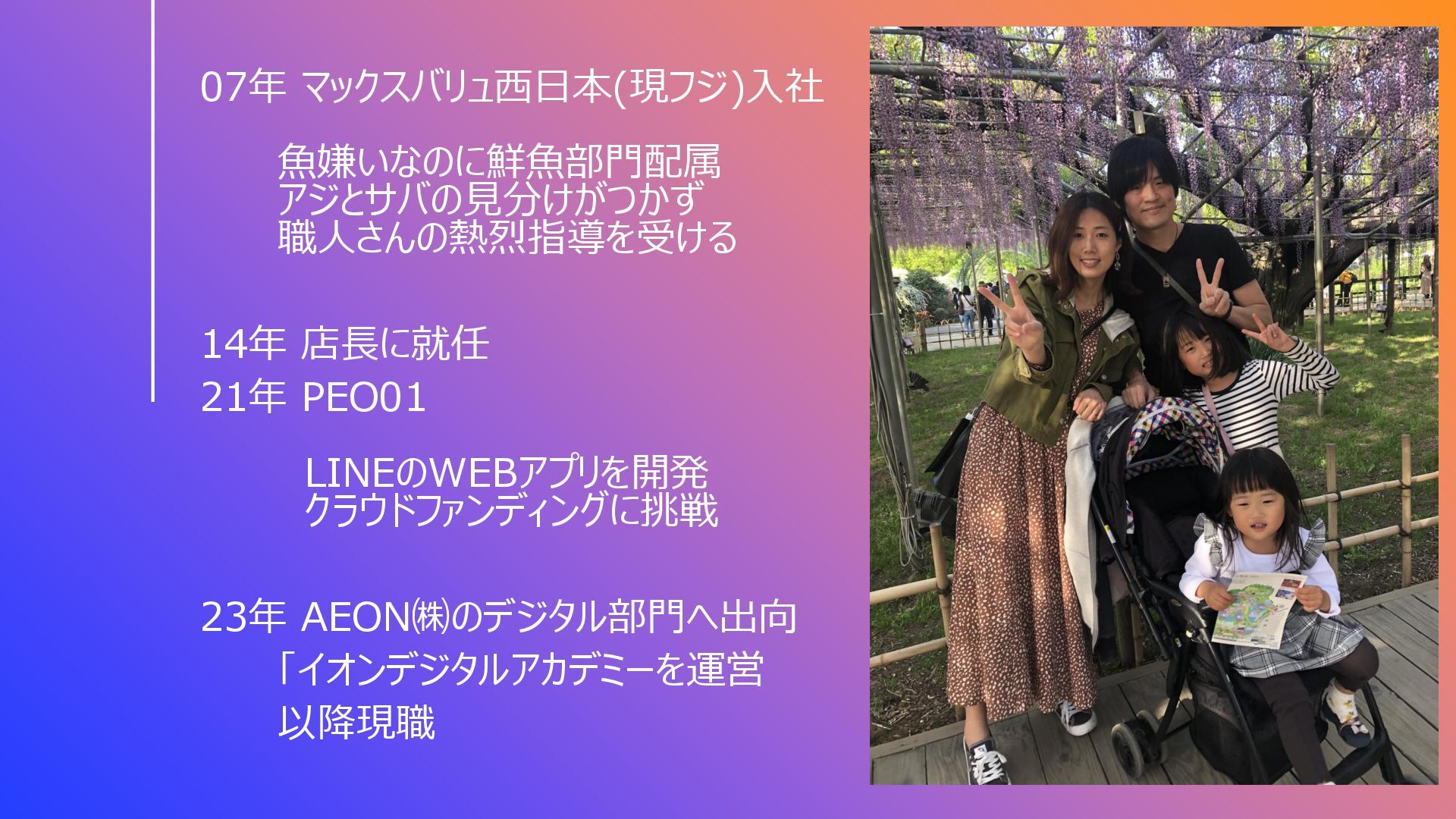 07年 マックスバリュ西日本(現フジ)入社 魚嫌いなのに鮮魚部門配属 アジとサバの見分けがつかず 職人さんの熱烈指導を受ける 14年 店長に就任 21年 PEO01 LINEのWEBアプリを開発