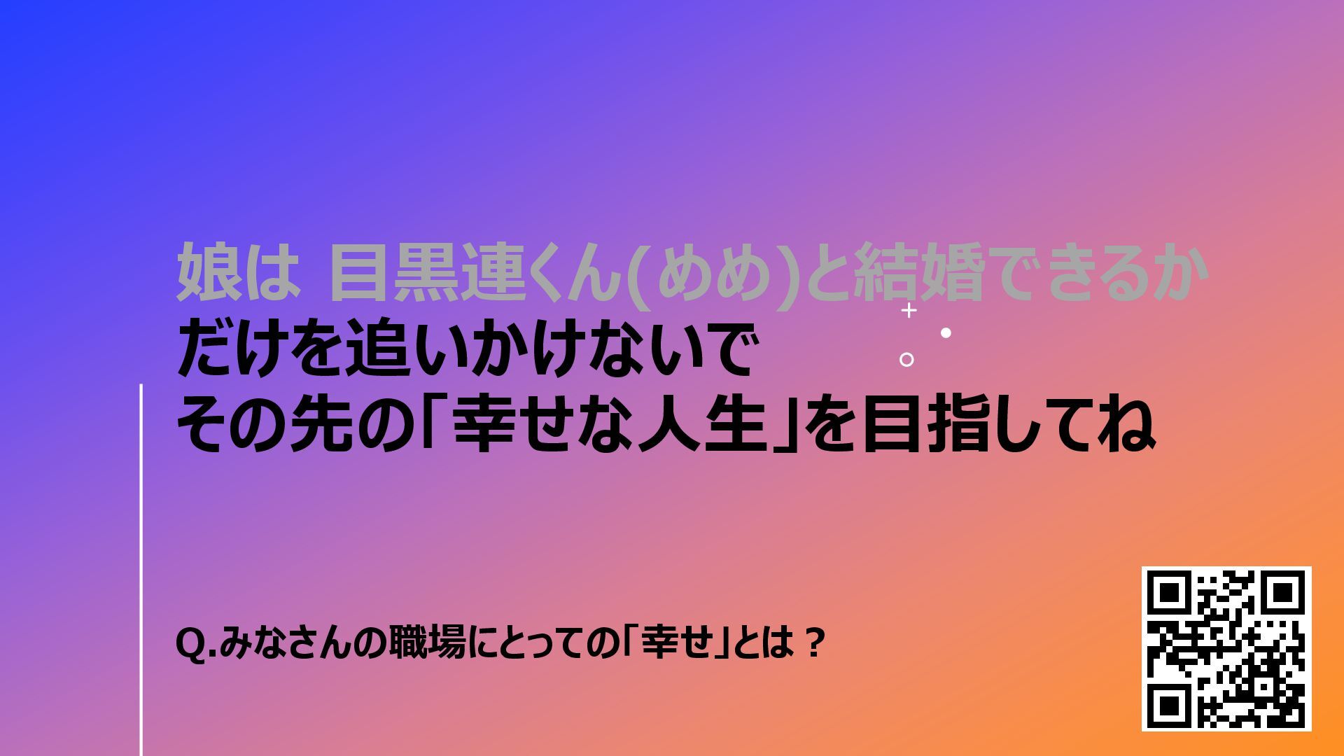 娘は 目黒連くん(めめ)と結婚できるか だけを追いかけないで その先の「幸せな人生」を目指してね Q.みなさんの職場にとっての「幸せ」とは?