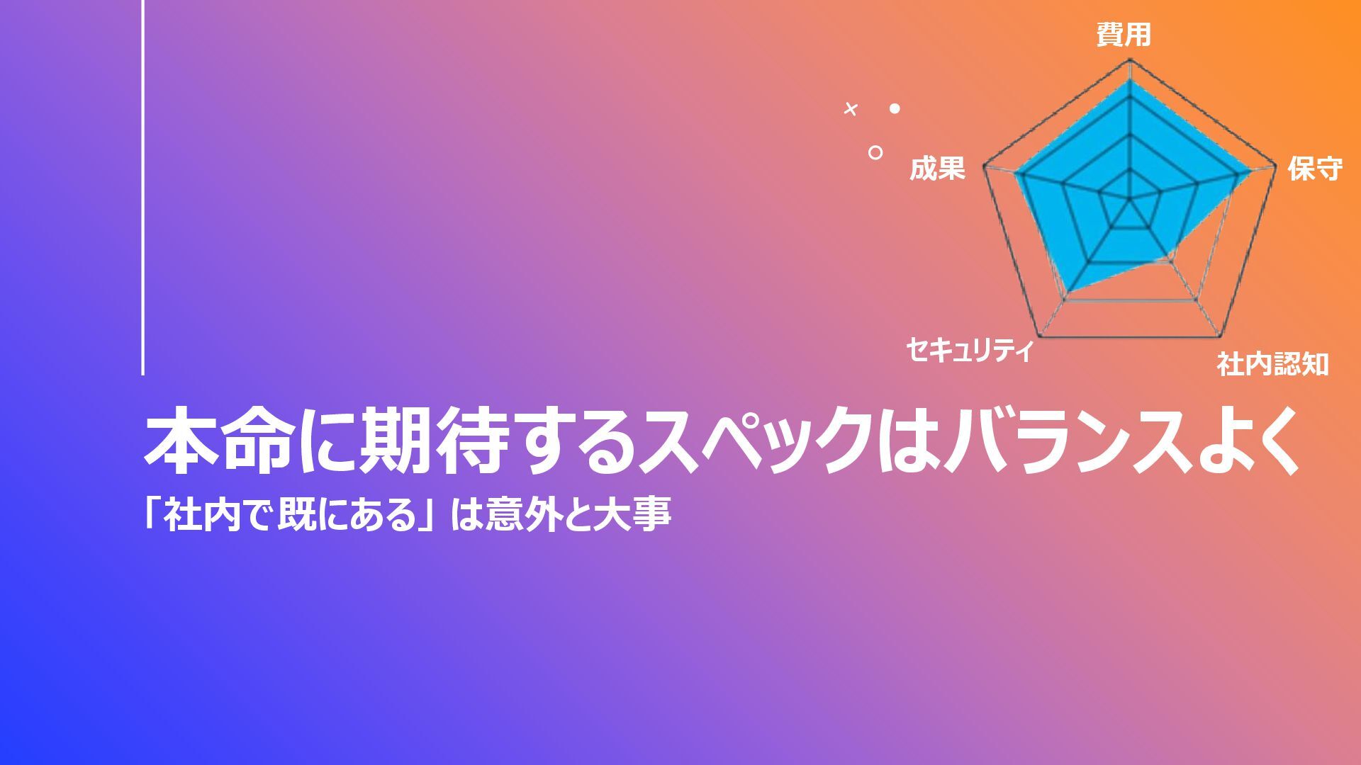 本命に期待するスペックはバランスよく 「社内で既にある」 は意外と大事 費用 成果 セキュリティ 保守 社内認知