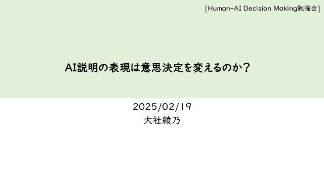 Explanation Tone on Decision-Making ※ 本スライド内の参考文献番号は, 論文の参考文献番号に対応しています 著者: Ayano Okoso, Mingzhe Yang, Yukino Baba 発表: CHI2025 AI説明の表現(トーン:フォーマルやカジュアルなど)は意思決定に影響を及ぼし, AIの役割・ユーザ属性によって影響が異なることを明らかにした 中立トーン 介入トーン タスクのスコア変化から, 意思決定に及ぼす影響を検証する • 映画推薦 ( アシスタント) • 意見形成 ( セカンドオピニオ ン) • 再犯リスク予測 ( 専門家) 3つのシナリオで ユーザ実験を実施 2/30