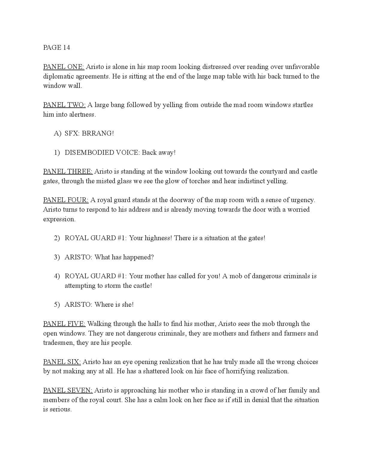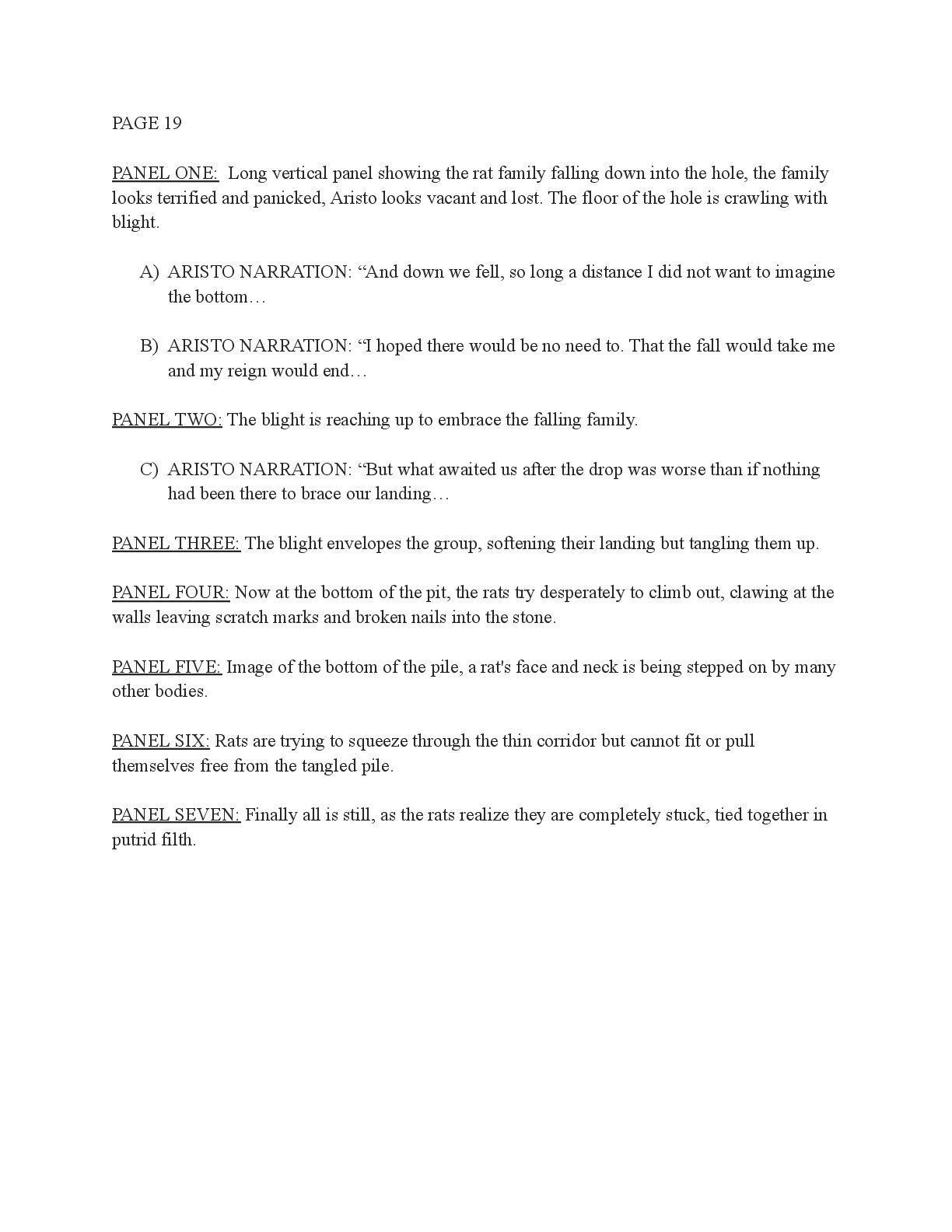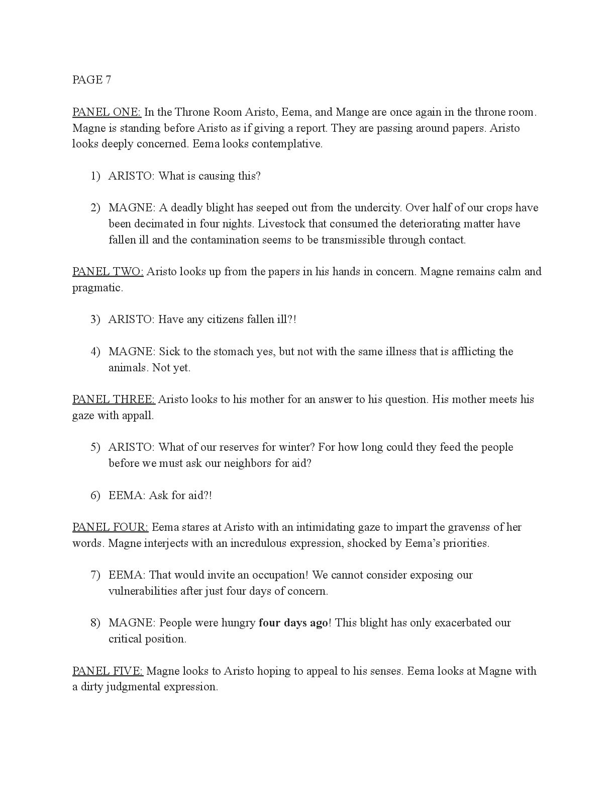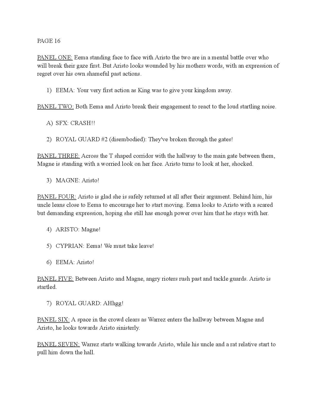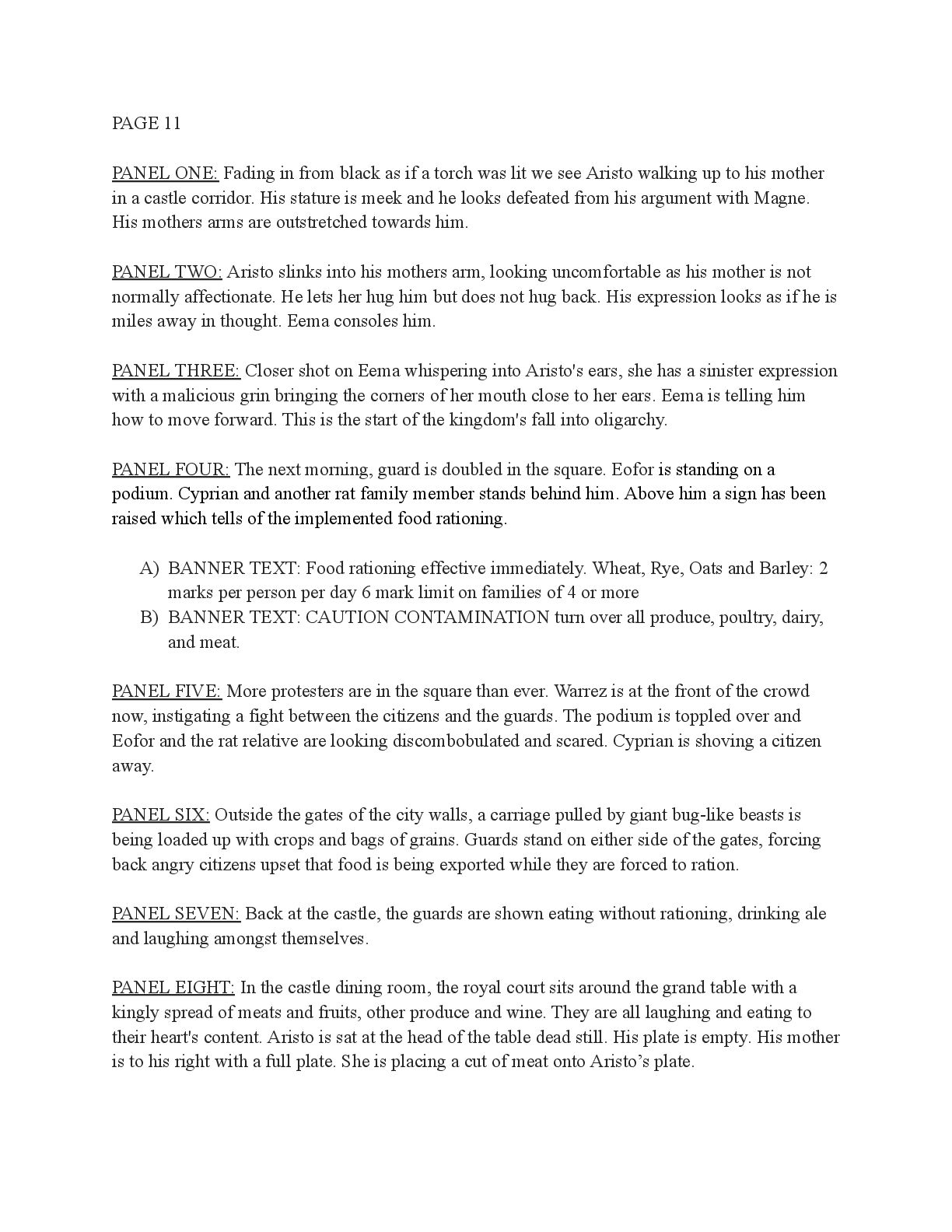 a torch was lit we see Aristo walking up to his mother in a castle corridor. His stature is meek and he looks defeated from his argument with Magne. His mothers arms are outstretched towards him. PANEL TWO: Aristo slinks into his mothers arm, looking uncomfortable as his mother is not normally affectionate. He lets her hug him but does not hug back. His expression looks as if he is miles away in thought. Eema consoles him. PANEL THREE: Closer shot on Eema whispering into Aristo's ears, she has a sinister expression with a malicious grin bringing the corners of her mouth close to her ears. Eema is telling him how to move forward. This is the start of the kingdom's fall into oligarchy. PANEL FOUR: The next morning, guard is doubled in the square. Eofor is standing on a podium. Cyprian and another rat family member stands behind him. Above him a sign has been raised which tells of the implemented food rationing. A) BANNER TEXT: Food rationing effective immediately. Wheat, Rye, Oats and Barley: 2 marks per person per day 6 mark limit on families of 4 or more B) BANNER TEXT: CAUTION CONTAMINATION turn over all produce, poultry, dairy, and meat. PANEL FIVE: More protesters are in the square than ever. Warrez is at the front of the crowd now, instigating a fight between the citizens and the guards. The podium is toppled over and Eofor and the rat relative are looking discombobulated and scared. Cyprian is shoving a citizen away. PANEL SIX: Outside the gates of the city walls, a carriage pulled by giant bug-like beasts is being loaded up with crops and bags of grains. Guards stand on either side of the gates, forcing back angry citizens upset that food is being exported while they are forced to ration. PANEL SEVEN: Back at the castle, the guards are shown eating without rationing, drinking ale and laughing amongst themselves. PANEL EIGHT: In the castle dining room, the royal court sits around the grand table with a kingly spread of meats and fruits, other produce and wine. They are all laughing and eating to their heart's content. Aristo is sat at the head of the table dead still. His plate is empty. His mother is to his right with a full plate. She is placing a cut of meat onto Aristo’s plate.