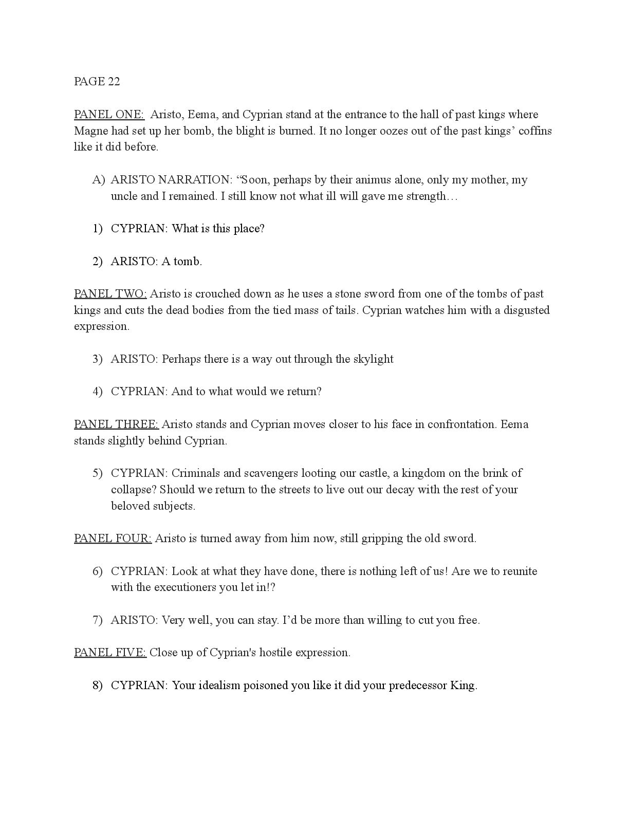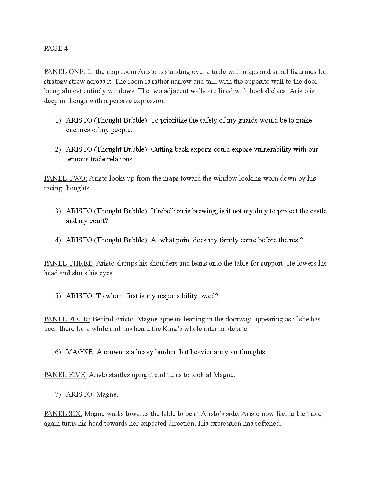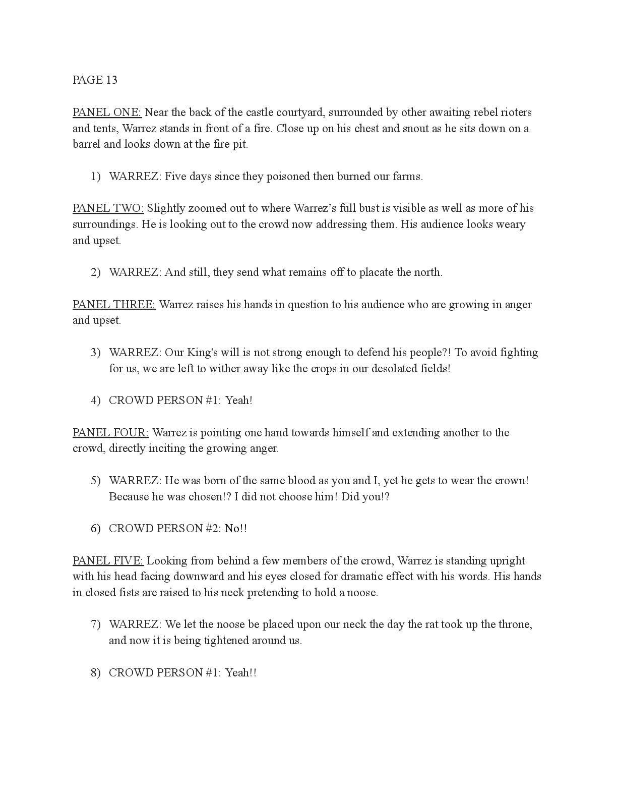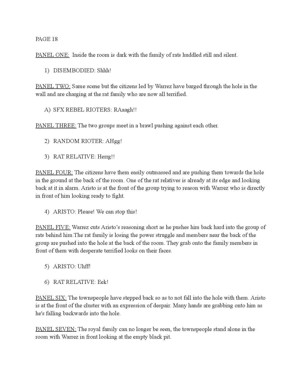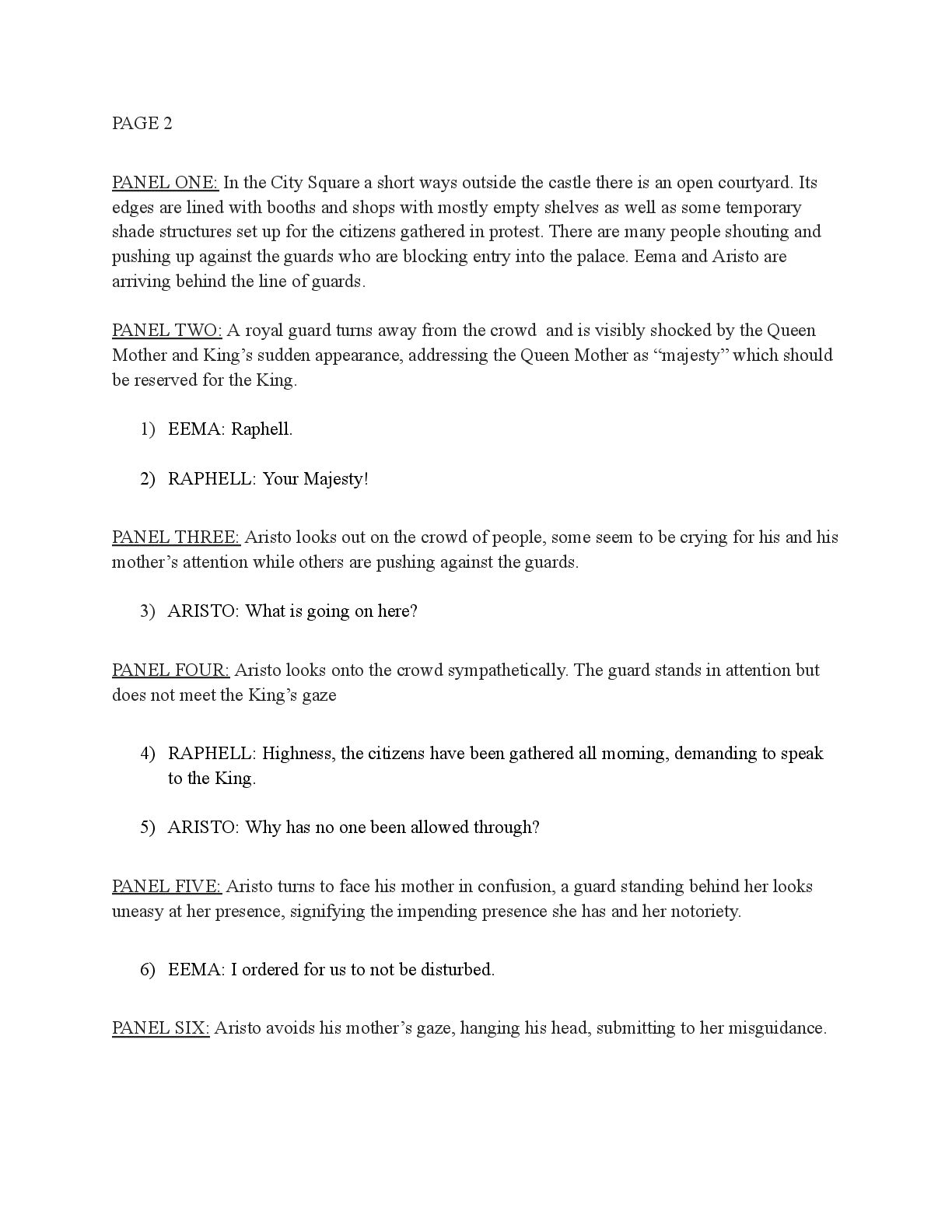 a torch was lit we see Aristo walking up to his mother in a castle corridor. His stature is meek and he looks defeated from his argument with Magne. His mothers arms are outstretched towards him. PANEL TWO: Aristo slinks into his mothers arm, looking uncomfortable as his mother is not normally affectionate. He lets her hug him but does not hug back. His expression looks as if he is miles away in thought. Eema consoles him. PANEL THREE: Closer shot on Eema whispering into Aristo's ears, she has a sinister expression with a malicious grin bringing the corners of her mouth close to her ears. Eema is telling him how to move forward. This is the start of the kingdom's fall into oligarchy. PANEL FOUR: The next morning, guard is doubled in the square. Eofor is standing on a podium. Cyprian and another rat family member stands behind him. Above him a sign has been raised which tells of the implemented food rationing. A) BANNER TEXT: Food rationing effective immediately. Wheat, Rye, Oats and Barley: 2 marks per person per day 6 mark limit on families of 4 or more B) BANNER TEXT: CAUTION CONTAMINATION turn over all produce, poultry, dairy, and meat. PANEL FIVE: More protesters are in the square than ever. Warrez is at the front of the crowd now, instigating a fight between the citizens and the guards. The podium is toppled over and Eofor and the rat relative are looking discombobulated and scared. Cyprian is shoving a citizen away. PANEL SIX: Outside the gates of the city walls, a carriage pulled by giant bug-like beasts is being loaded up with crops and bags of grains. Guards stand on either side of the gates, forcing back angry citizens upset that food is being exported while they are forced to ration. PANEL SEVEN: Back at the castle, the guards are shown eating without rationing, drinking ale and laughing amongst themselves. PANEL EIGHT: In the castle dining room, the royal court sits around the grand table with a kingly spread of meats and fruits, other produce and wine. They are all laughing and eating to their heart's content. Aristo is sat at the head of the table dead still. His plate is empty. His mother is to his right with a full plate. She is placing a cut of meat onto Aristo’s plate.