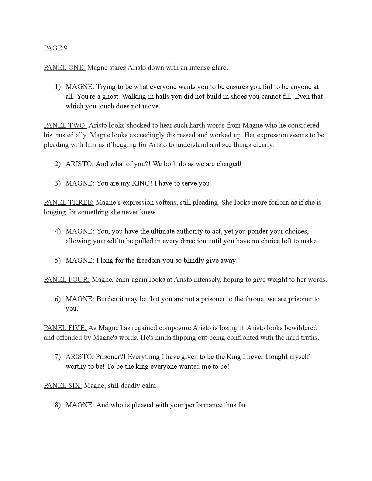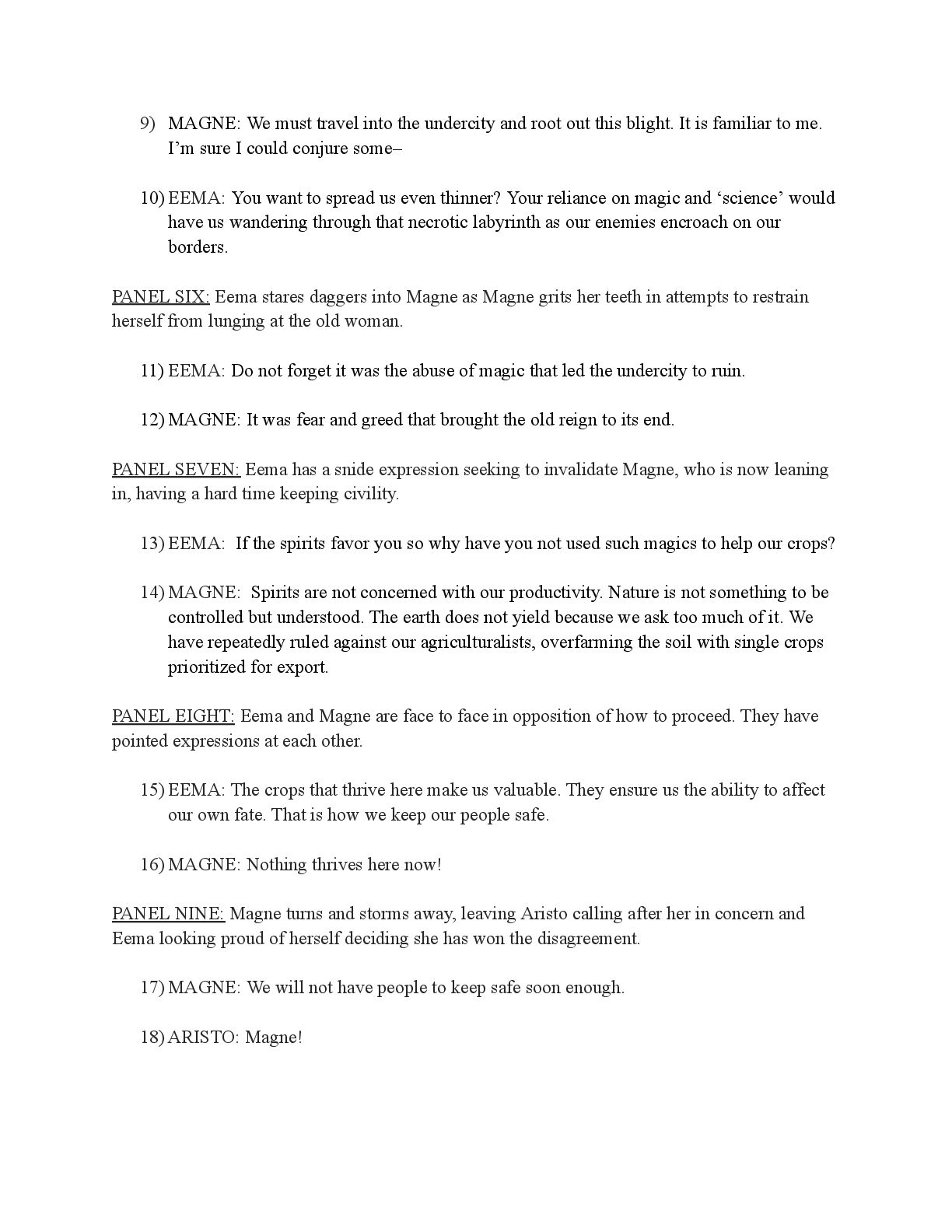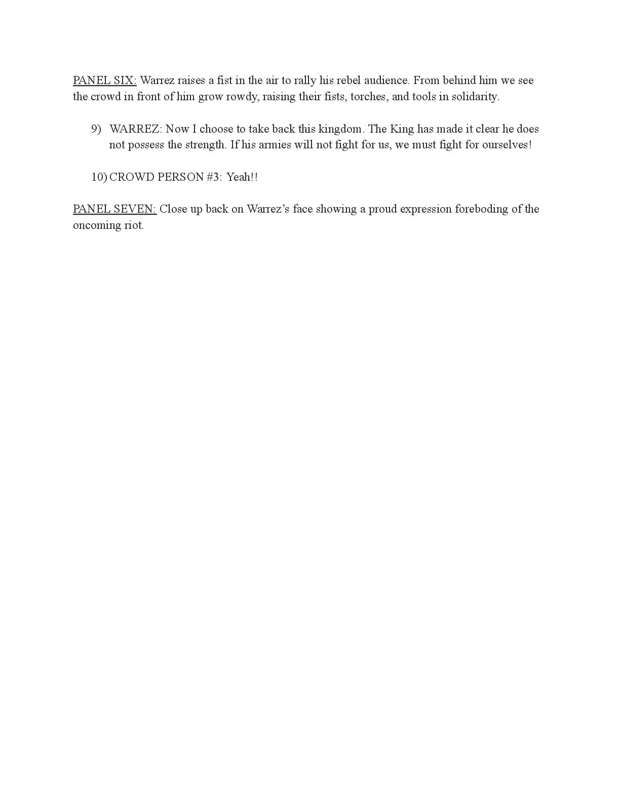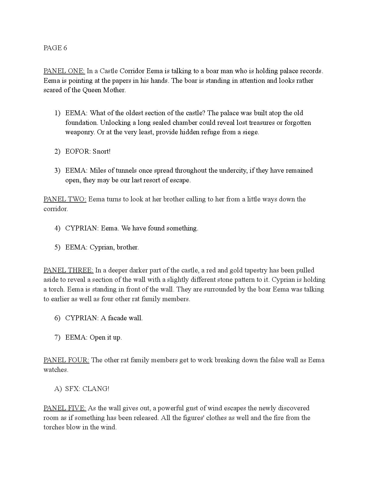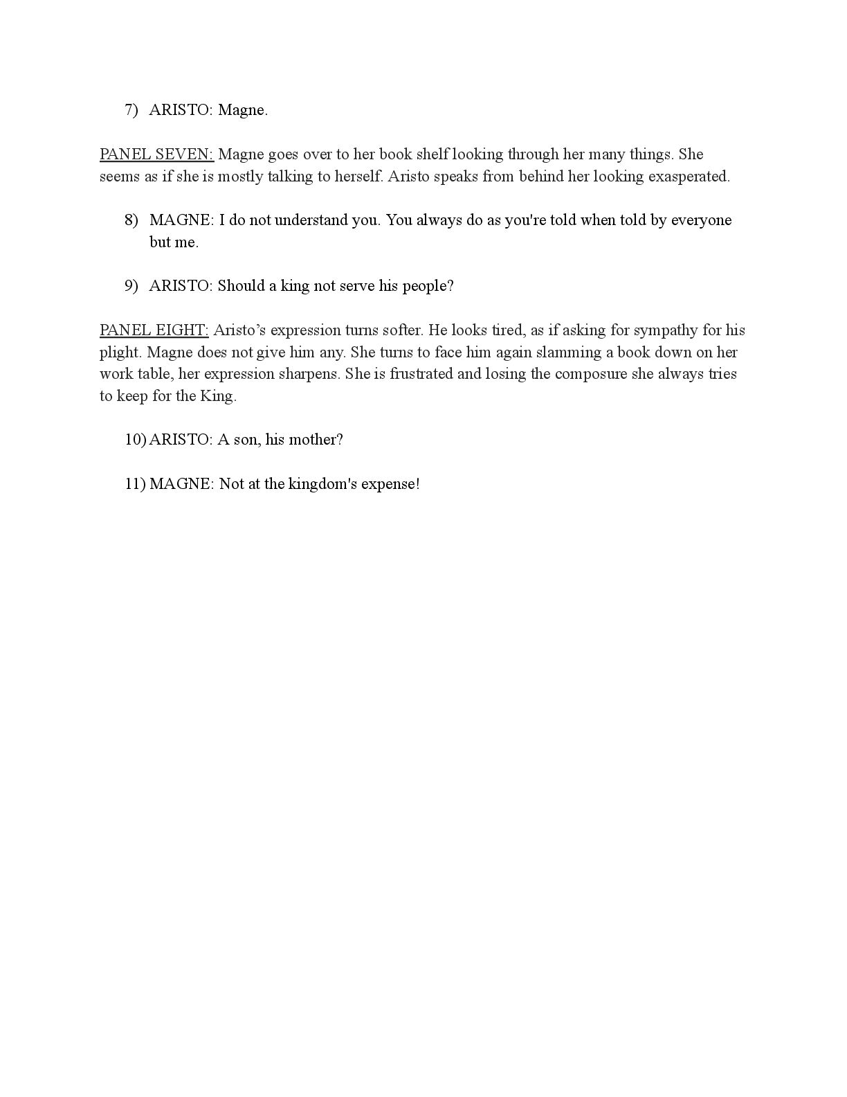 a torch was lit we see Aristo walking up to his mother in a castle corridor. His stature is meek and he looks defeated from his argument with Magne. His mothers arms are outstretched towards him. PANEL TWO: Aristo slinks into his mothers arm, looking uncomfortable as his mother is not normally affectionate. He lets her hug him but does not hug back. His expression looks as if he is miles away in thought. Eema consoles him. PANEL THREE: Closer shot on Eema whispering into Aristo's ears, she has a sinister expression with a malicious grin bringing the corners of her mouth close to her ears. Eema is telling him how to move forward. This is the start of the kingdom's fall into oligarchy. PANEL FOUR: The next morning, guard is doubled in the square. Eofor is standing on a podium. Cyprian and another rat family member stands behind him. Above him a sign has been raised which tells of the implemented food rationing. A) BANNER TEXT: Food rationing effective immediately. Wheat, Rye, Oats and Barley: 2 marks per person per day 6 mark limit on families of 4 or more B) BANNER TEXT: CAUTION CONTAMINATION turn over all produce, poultry, dairy, and meat. PANEL FIVE: More protesters are in the square than ever. Warrez is at the front of the crowd now, instigating a fight between the citizens and the guards. The podium is toppled over and Eofor and the rat relative are looking discombobulated and scared. Cyprian is shoving a citizen away. PANEL SIX: Outside the gates of the city walls, a carriage pulled by giant bug-like beasts is being loaded up with crops and bags of grains. Guards stand on either side of the gates, forcing back angry citizens upset that food is being exported while they are forced to ration. PANEL SEVEN: Back at the castle, the guards are shown eating without rationing, drinking ale and laughing amongst themselves. PANEL EIGHT: In the castle dining room, the royal court sits around the grand table with a kingly spread of meats and fruits, other produce and wine. They are all laughing and eating to their heart's content. Aristo is sat at the head of the table dead still. His plate is empty. His mother is to his right with a full plate. She is placing a cut of meat onto Aristo’s plate.
